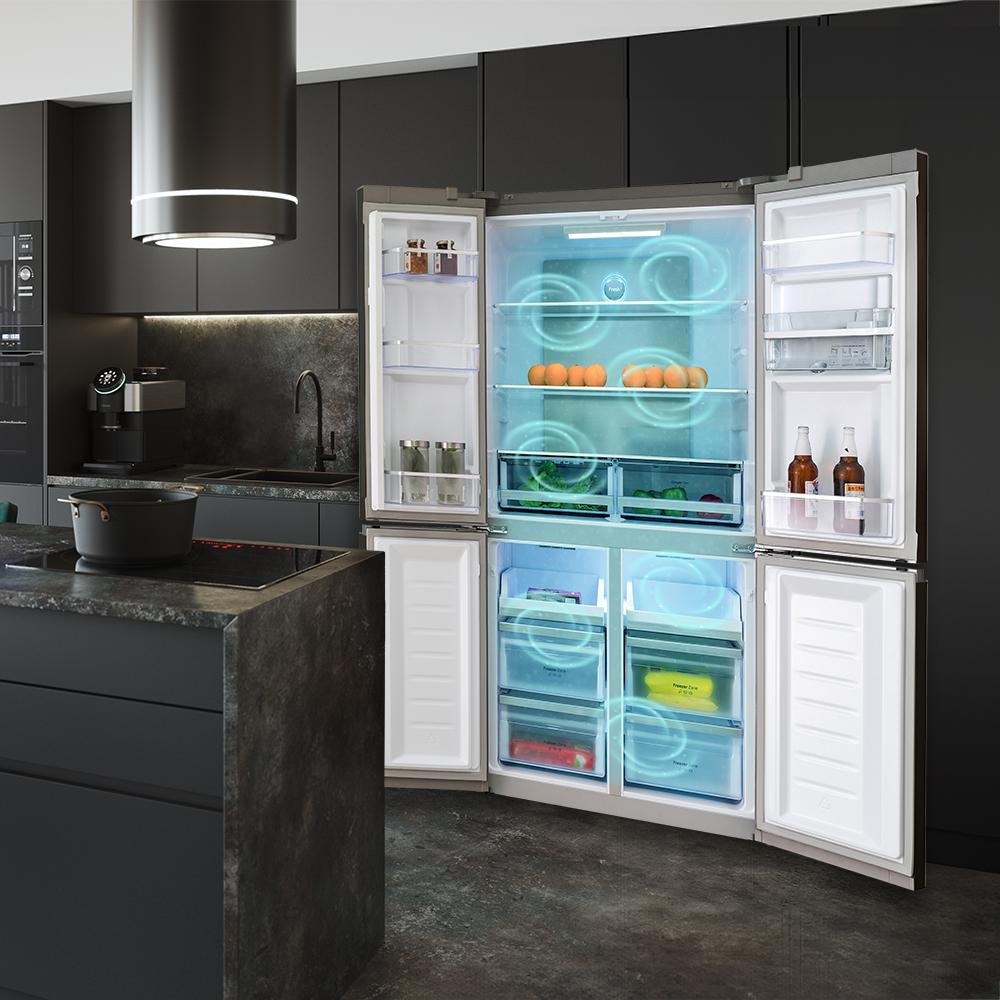 Guarda todos tus alimentos en su espacioso interior de 564 L con un consumo energético reducido gracias a su motor inverter plus y clasificación energética E. Además, su diseño de apertura mejora la conservación y permite ahorrar energía.