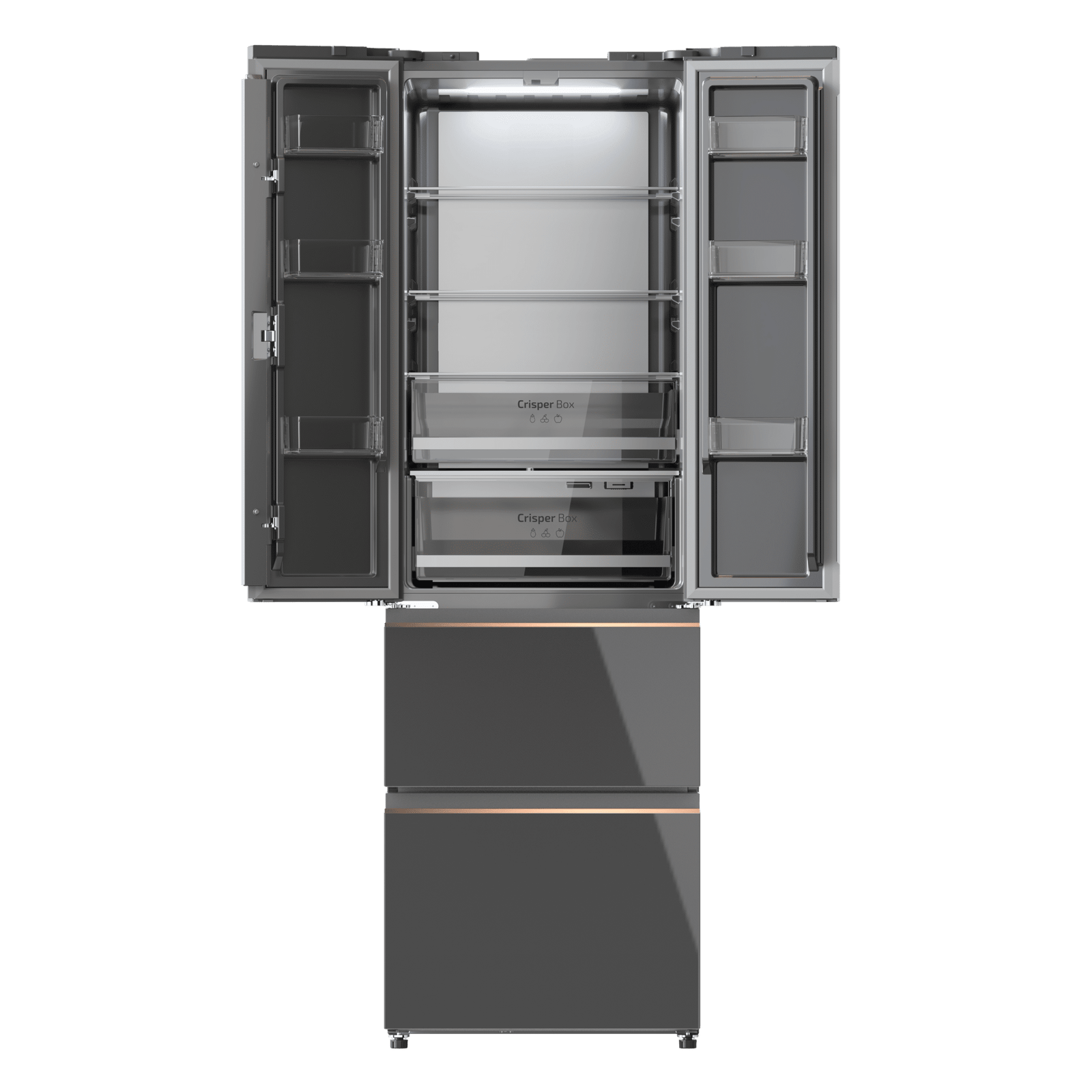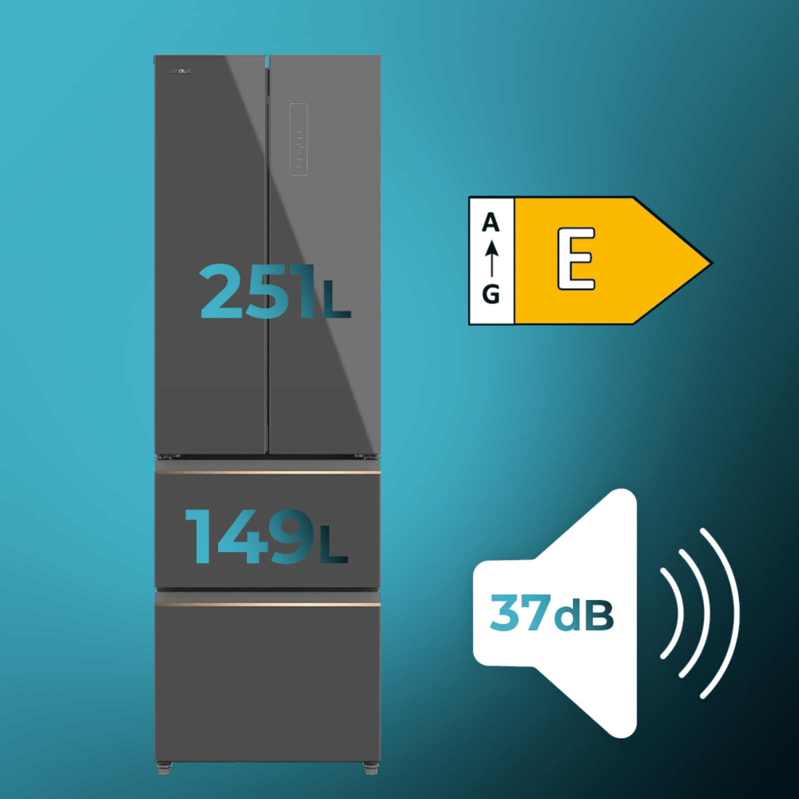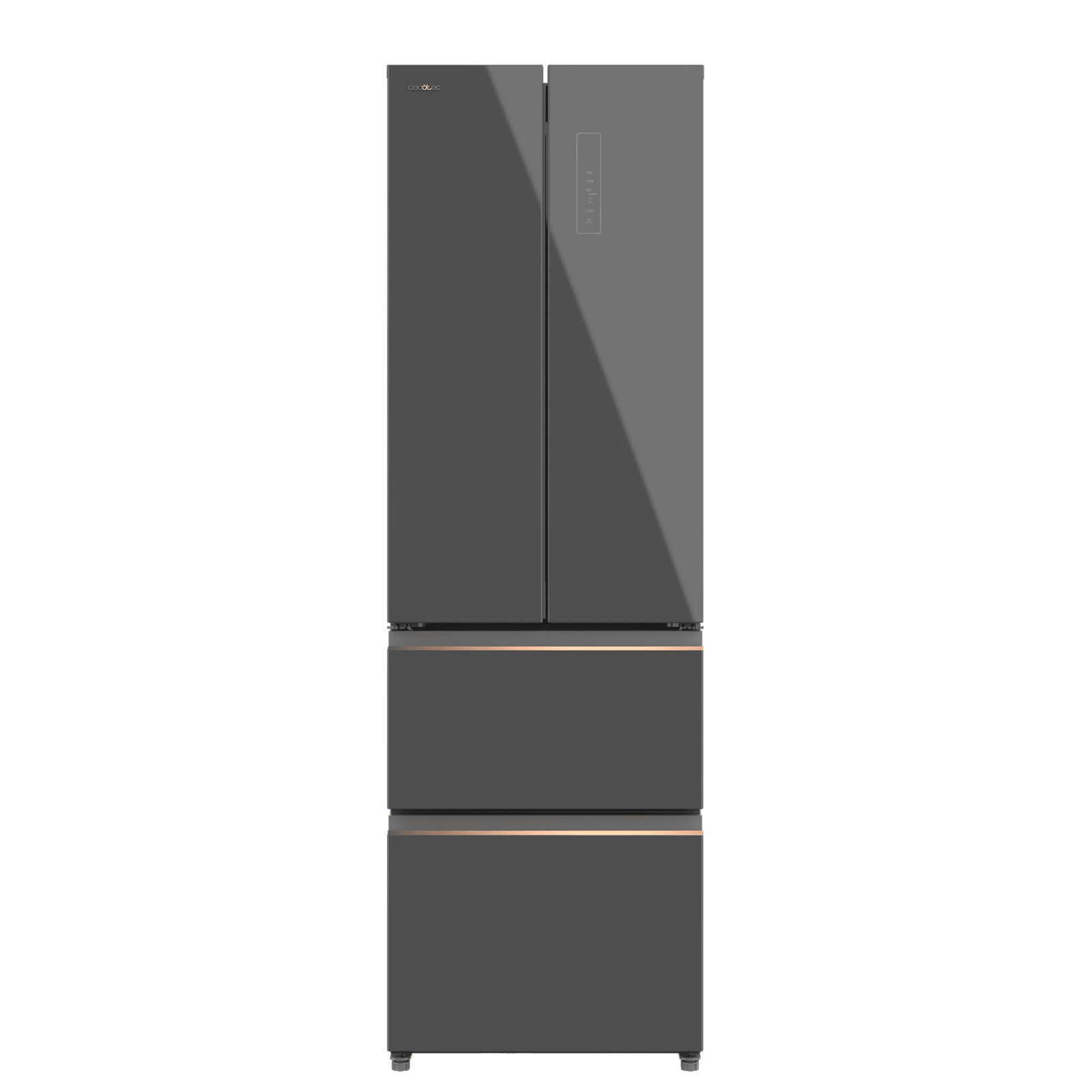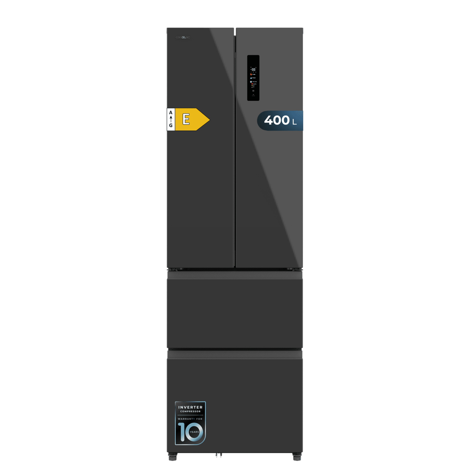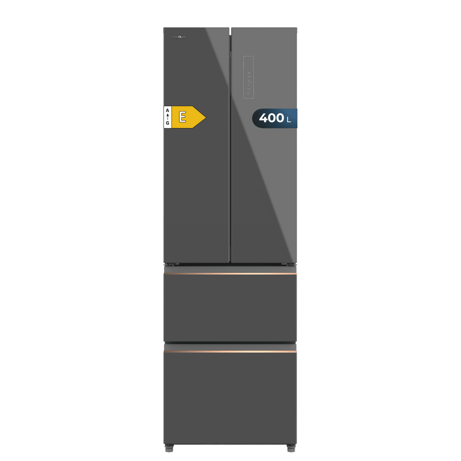 Bolero CoolMarket Combi F2D 400 Grey Glass E Frigorífico Combi French Door 4 Puertas Cristal Gris, Capacidad de 400 Litros, Ancho de 60 cm y alto de 191 cm, Sistema Total NoFrost, Max Inside, Distribución de frío Multi AirFlow, Display Digital Exterior, Clase E, Compresor Inverter de bajo consumo y silencioso, Funciones Fast Cooling, Fast Freezer, Modo ECO, Alarmas puerta abierta, temperatura y fallo de funcionamiento.