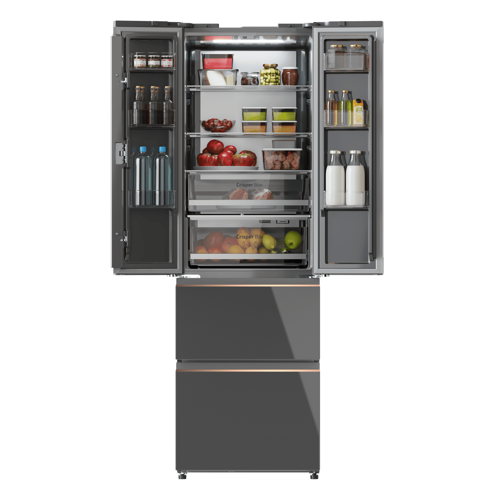 Domina el frío con su diseño de 4 puertas, 2 horizontales y 2 verticales, que te permiten abrir por zonas, mejorando la comodidad y la conservación del frío, al mismo tiempo que ahorra energía.