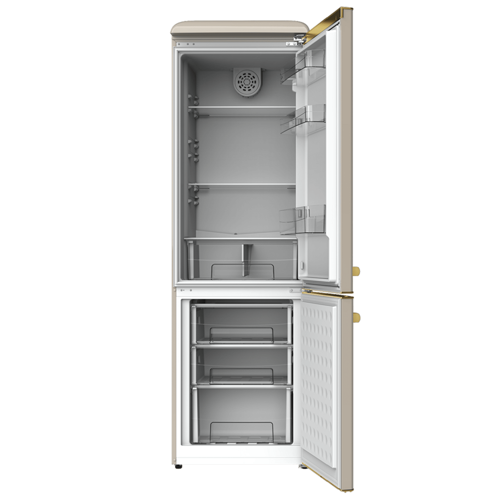 Bolero CoolMarket Combi Origin 300 Beige E Frigorífico retro combi Origin Beige con capacidad de 300L, clase E, iluminación interior, bandejas de cristal y tirador gold.
