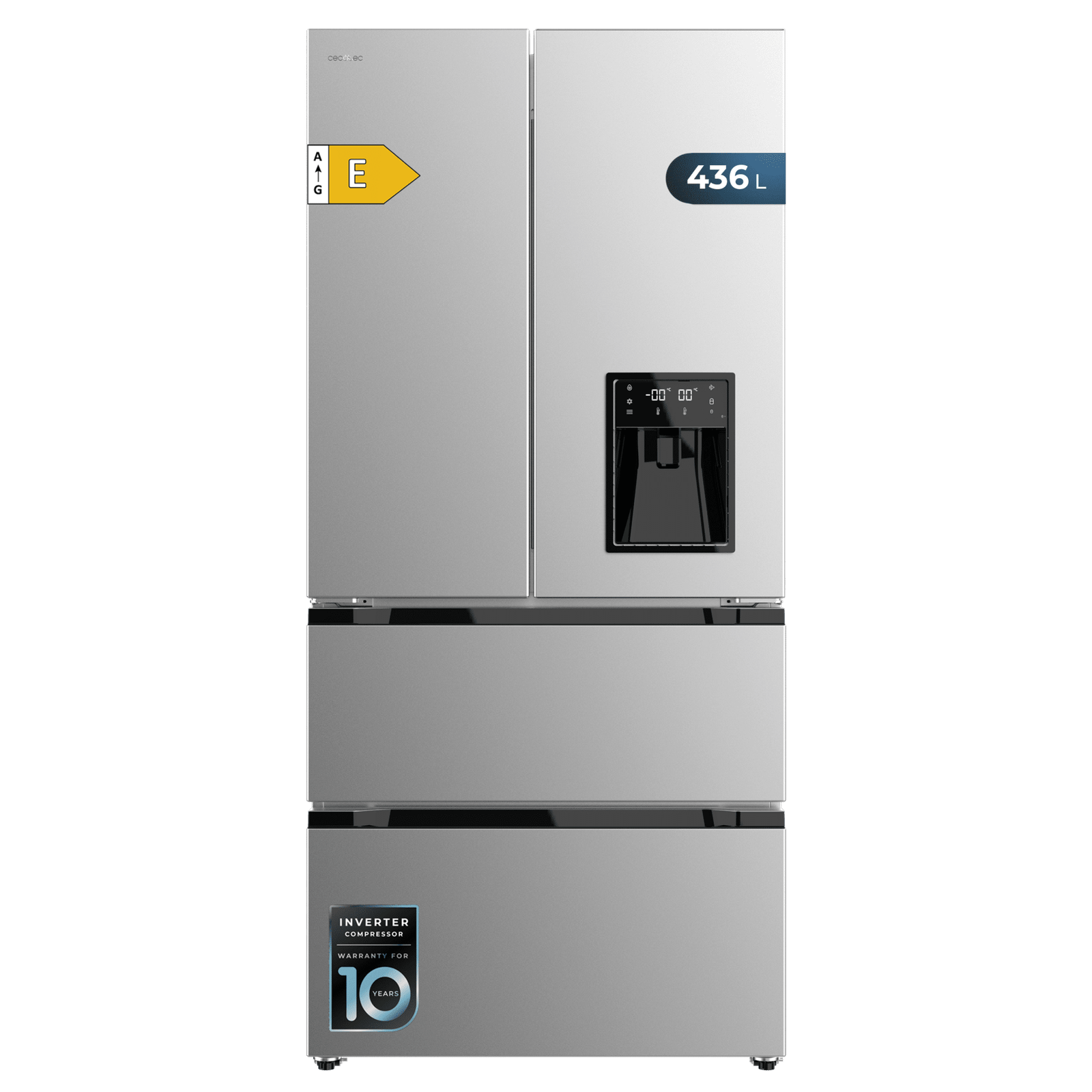 Bolero CoolMarket FD 436 WD Inox E Frigorífico puerta francesa inox con dispensador de agua, 183 cm de alto y 83,6 cm de ancho, capacidad 463L, compresor Inverter Plus, Total No Frost, clase energética E. Además, cuenta con distintos modos como Fast Cooling y Fast Freezing, así como sistemas como MultiAirFlow, Metal Cooling y modo vacaciones.