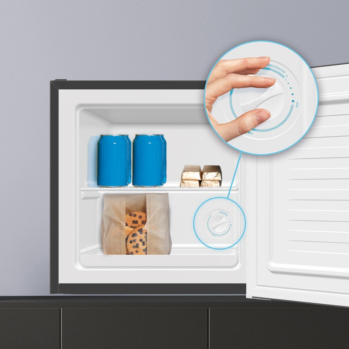 - Medidas mini frigorífico: 47,4 x 44,7 x 49,6 cm (ancho x fondo x alto).
