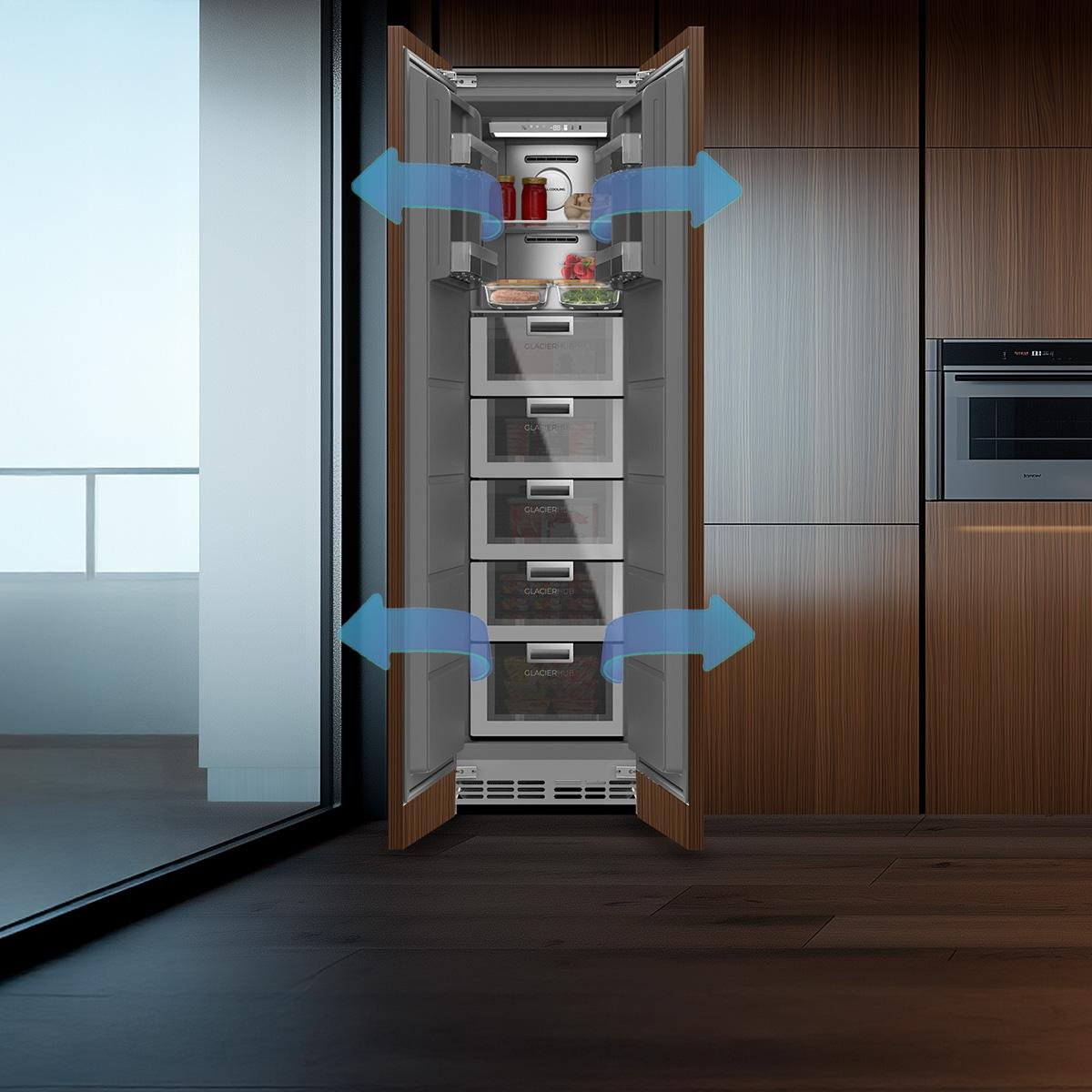 Bolero CoolMarket UF BI-D 222 GREY E Congelador 1 puerta integrable de puerta fija, 187×55,9cm, 222 Litros, Metal Cooling, Cavidad Interior gris prémium, Fast Freezing, modo Vacaciones y Clase Energética E,