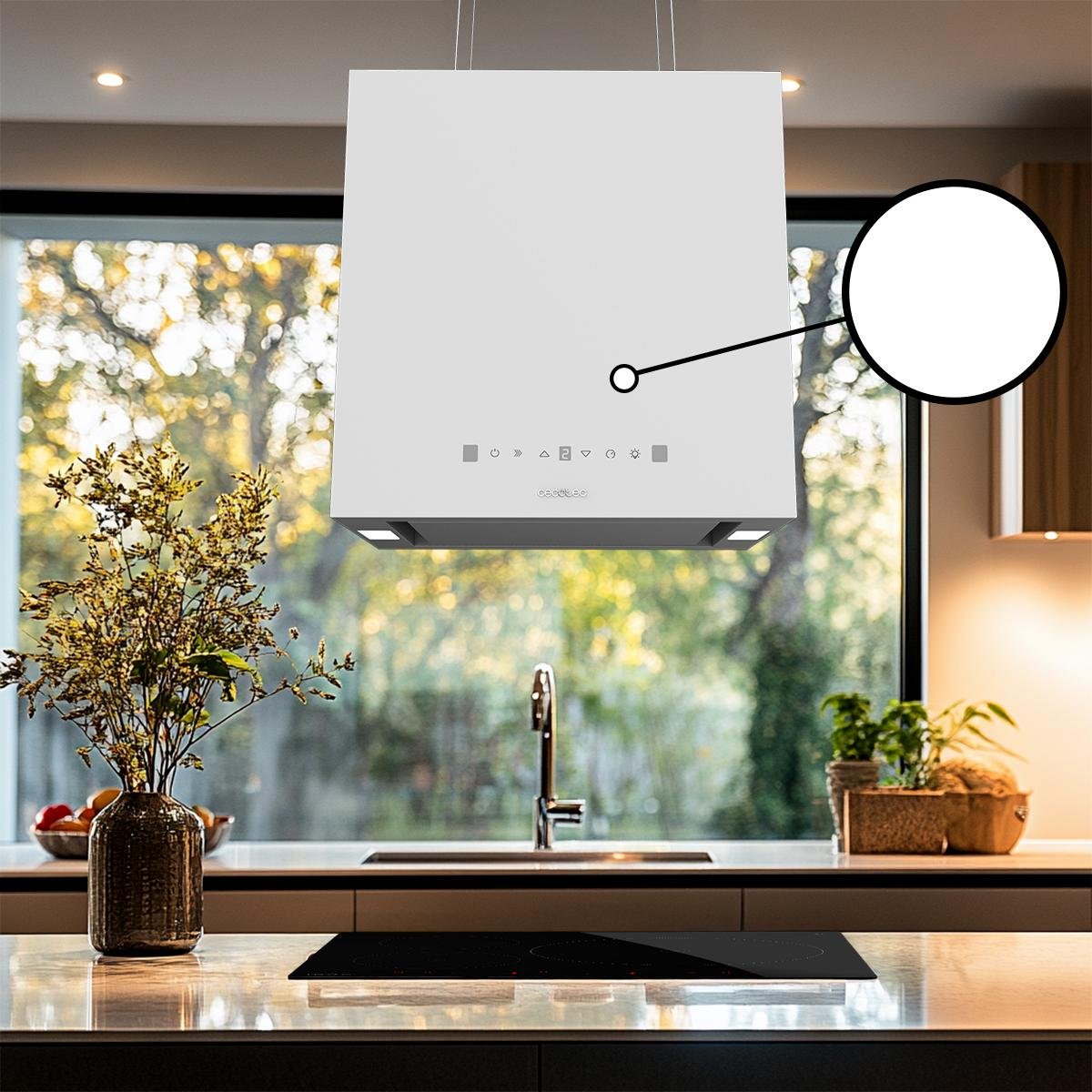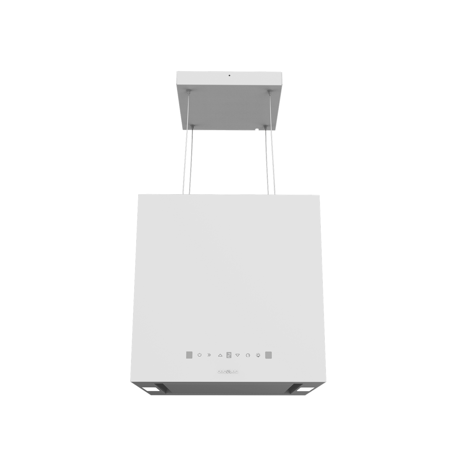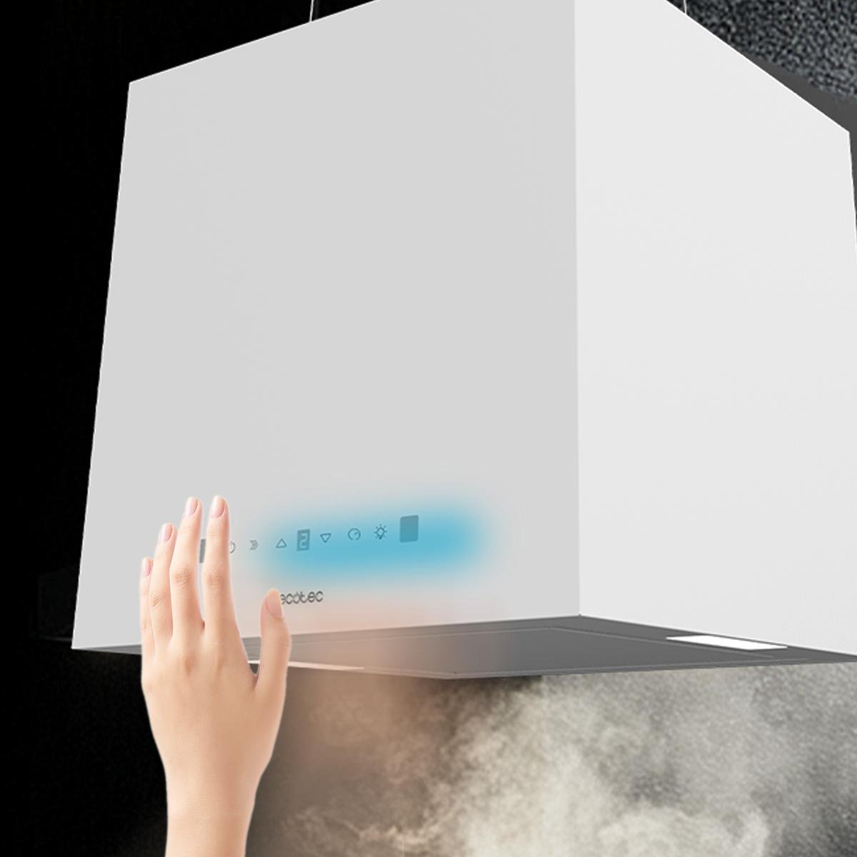 Bolero Flux CCT 448000 White A++ Campana colgante cuadrada de 44cm de ancho, acabado blanco, succión 800m3/h, Motor 210W, Clase A++, control táctil, 3 niveles de potencia, Booster, luz, filtro de carbono, Hand Movement Control y Delay Function.