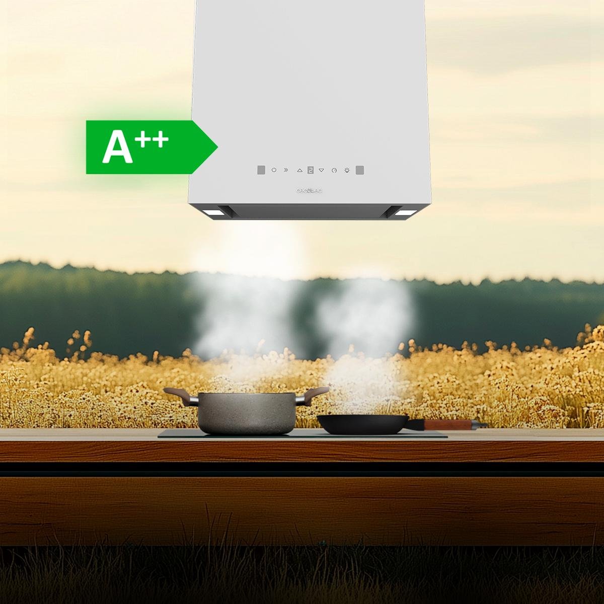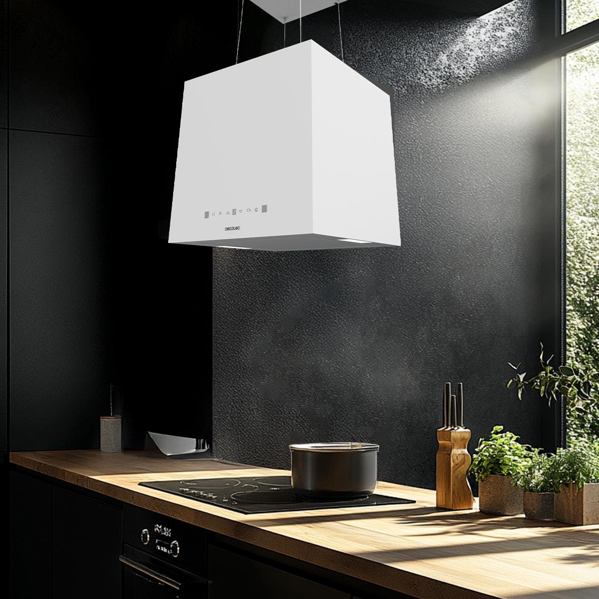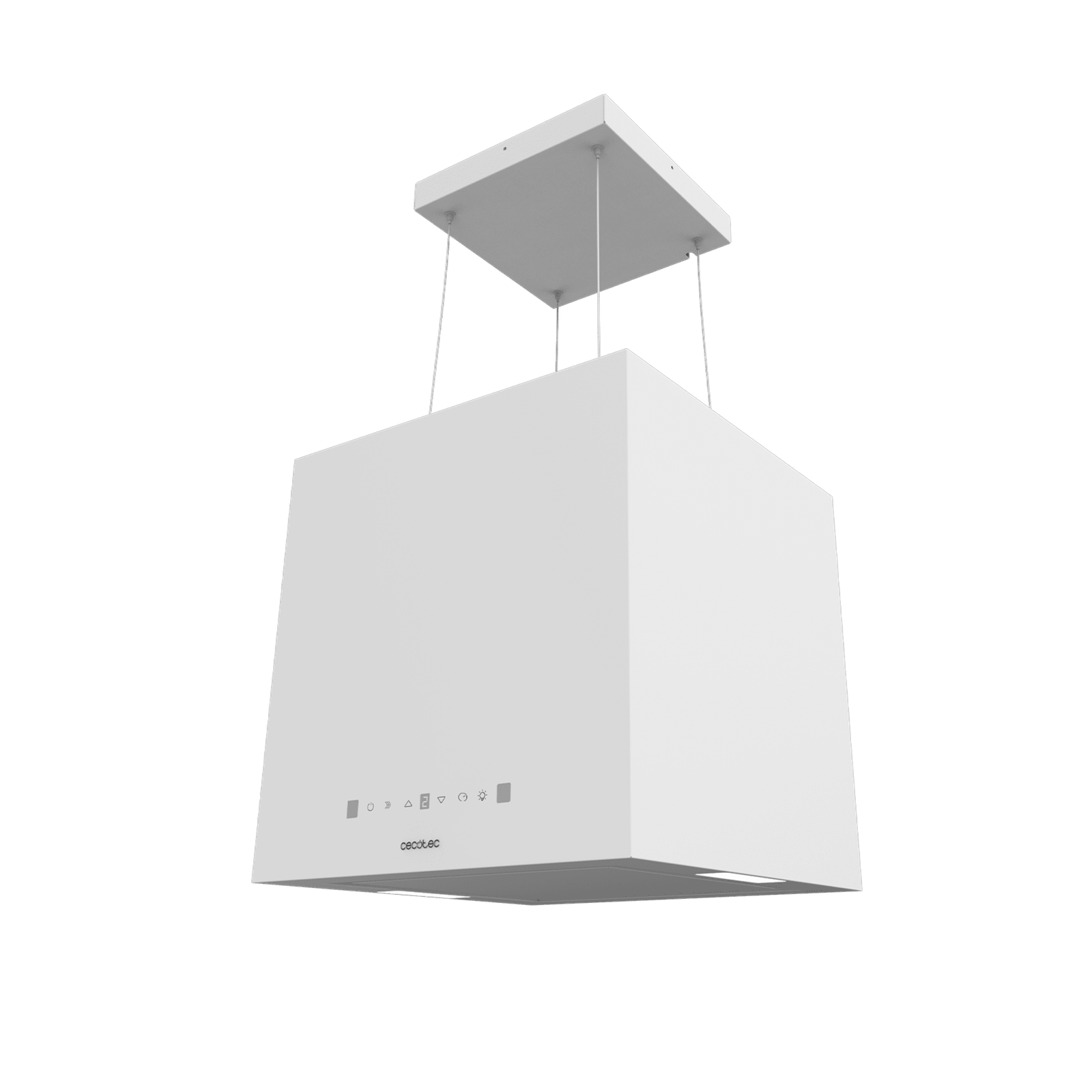 Bolero Flux CCT 448000 White A++ Campana colgante cuadrada de 44cm de ancho, acabado blanco, succión 800m3/h, Motor 210W, Clase A++, control táctil, 3 niveles de potencia, Booster, luz, filtro de carbono, Hand Movement Control y Delay Function.