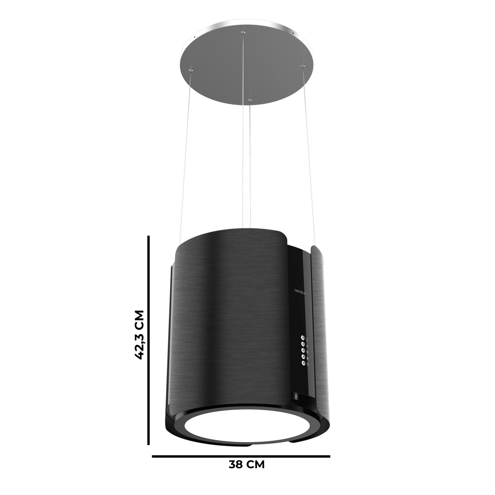 Bolero Flux CRE 385500 Negro A+ Campana colgante redonda de 38cm de diametro, Clase A+, Motor DC, Succión 591,2m3/h, Acabado en acero negro, Control de botones electrónicos, Filtro de Carbono.