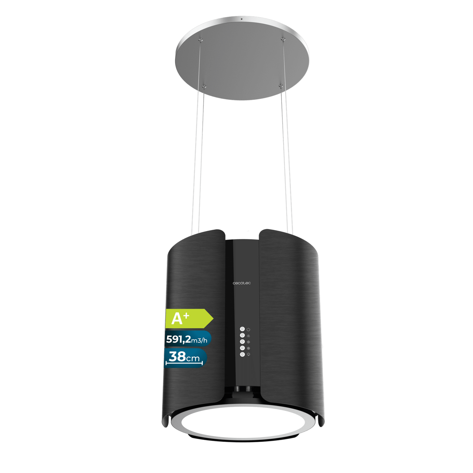 - La Cecotec Bolero Flux CRE 385500 Black A+ está diseñada como una campana isla colgante redonda de 38,5 cm de diámetro, aportando un estilo moderno y elegante que se convierte en el centro de todas las miradas en tu cocina.