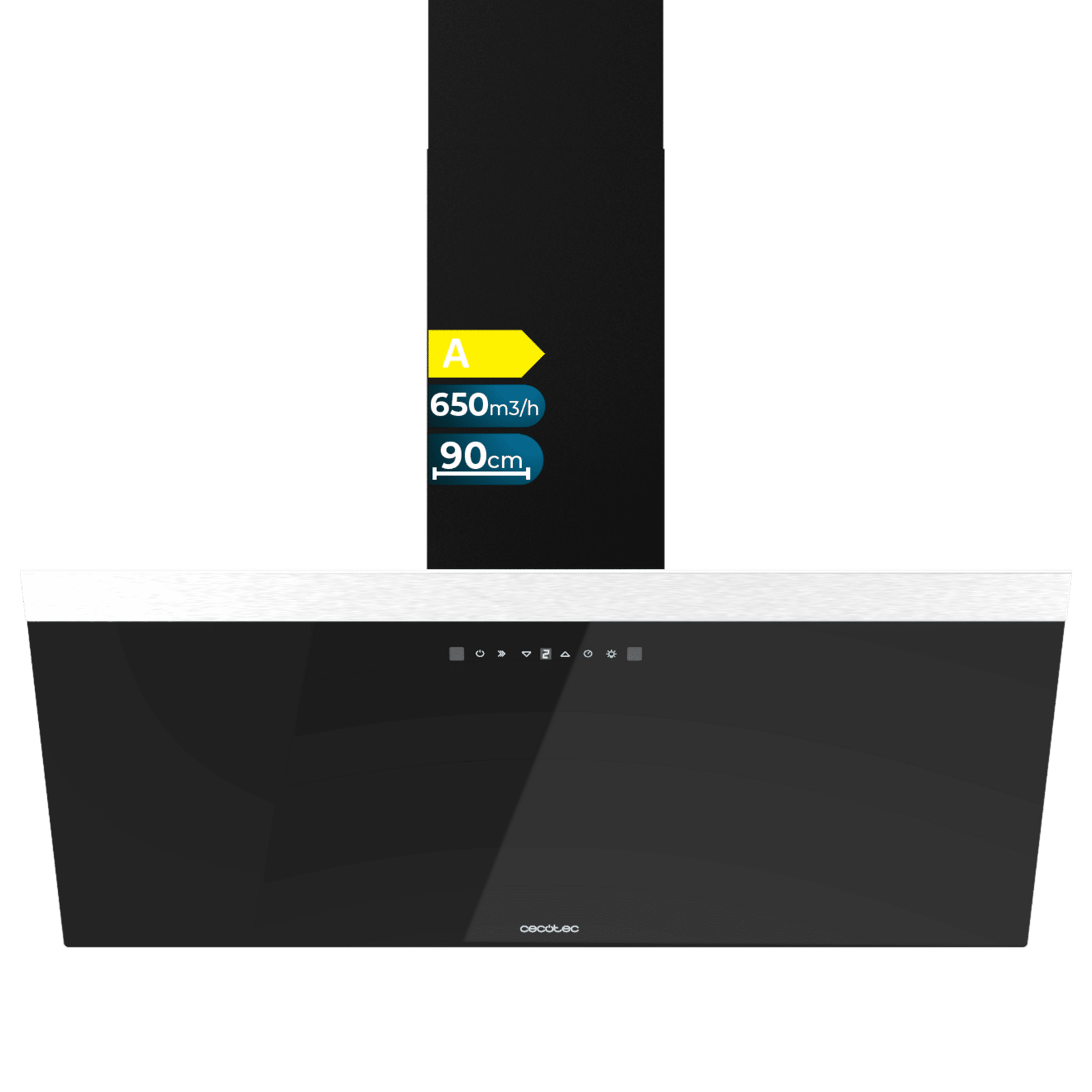 Bolero Flux DT 906500 Glass Black A Campana decorativa de 90cm de ancho, acabado frontal vidrio negro, chimenea negra, succión 650m3/h, Motor 165W, Clase A, control táctil, 3 niveles de potencia, Booster, luz, filtro de carbono y Hand Movement Control.