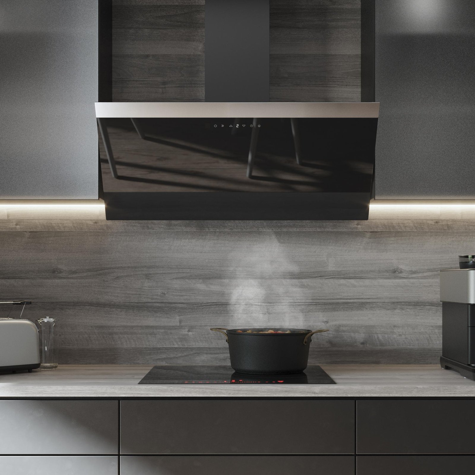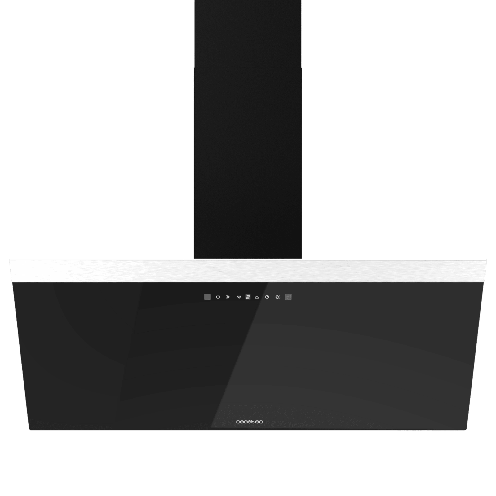 - Acabado frontal de vidrio negro: campana extractora con acabados frontales de vidrio y chimenea de color negro, para un diseño estilizado y elegante.
