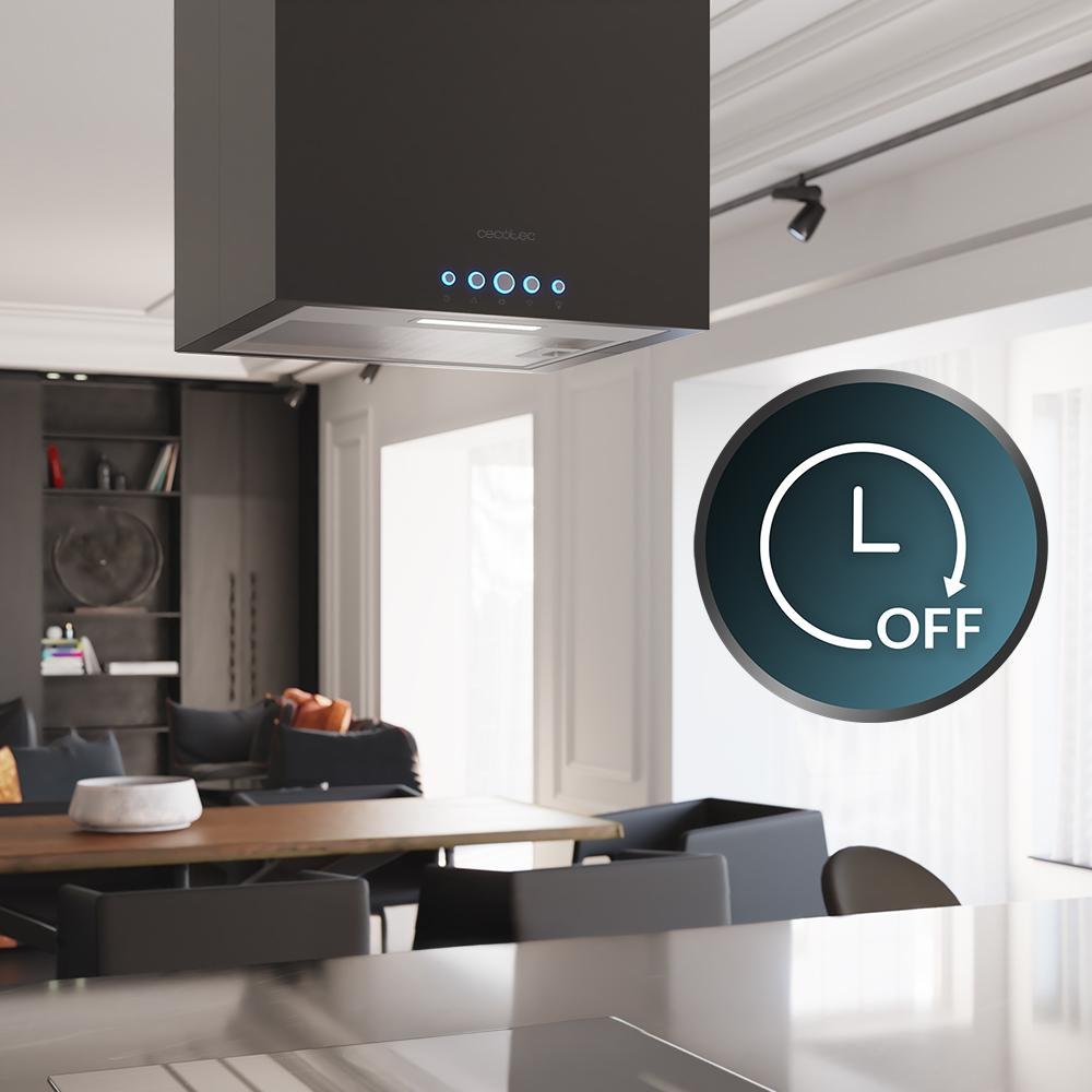Bolero Flux ICT 388000 Black A++ Campana isla cuadrada de ancho, acabado negro, succión 800m3/h, Motor 210W, Clase A++, control electrónico, 3 niveles de potencia, luz, filtro de carbono y Delay Function.