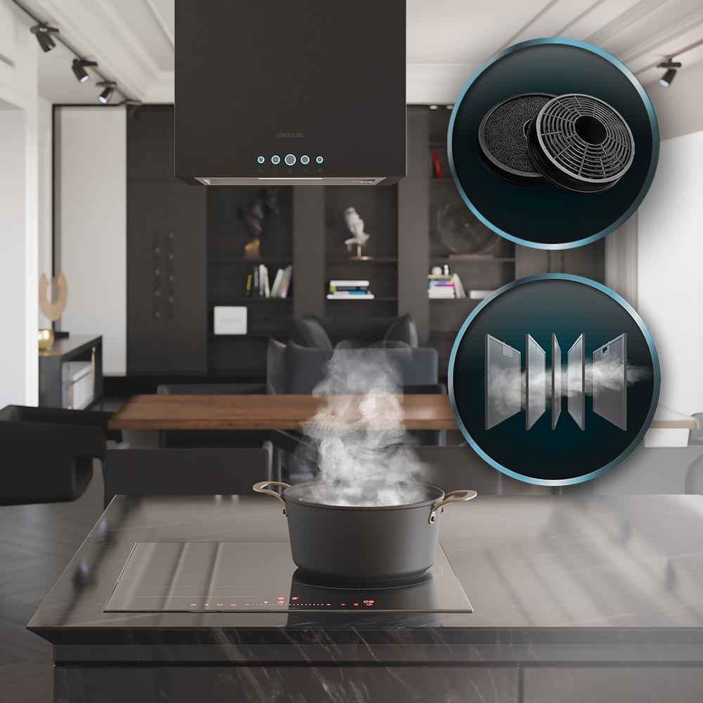 Su diseño incluye dos filtros de carbono de Ø176, ideales para eliminar tanto los malos olores como el humo. Además, cuenta con un filtro de aluminio contra la grasa de 5 capas.