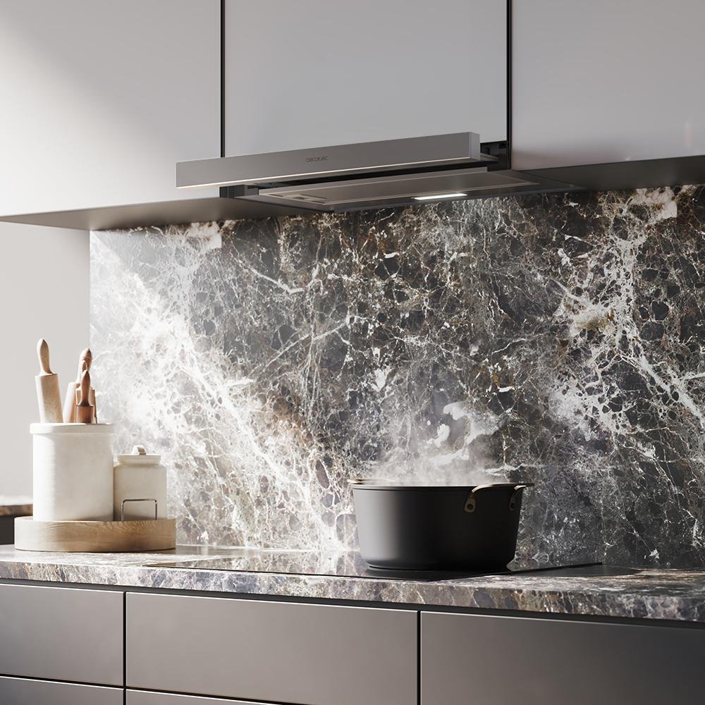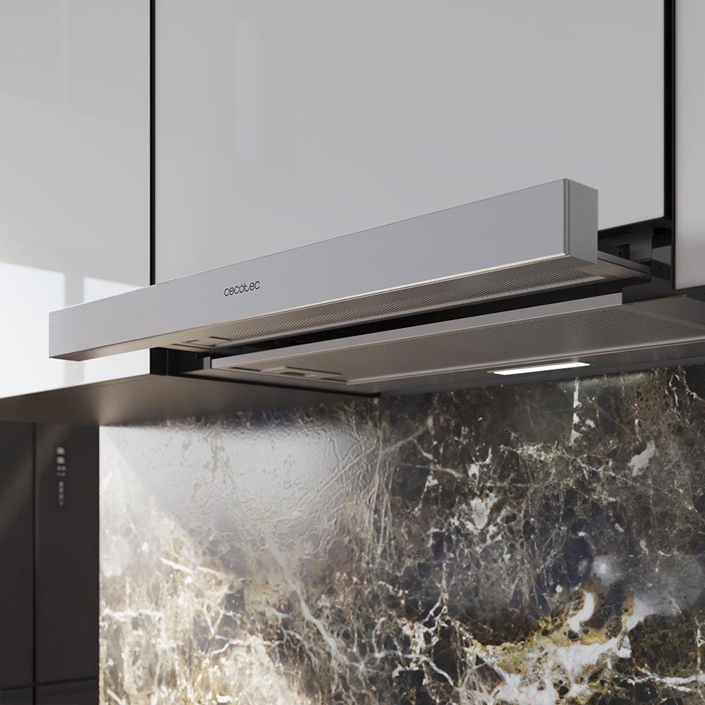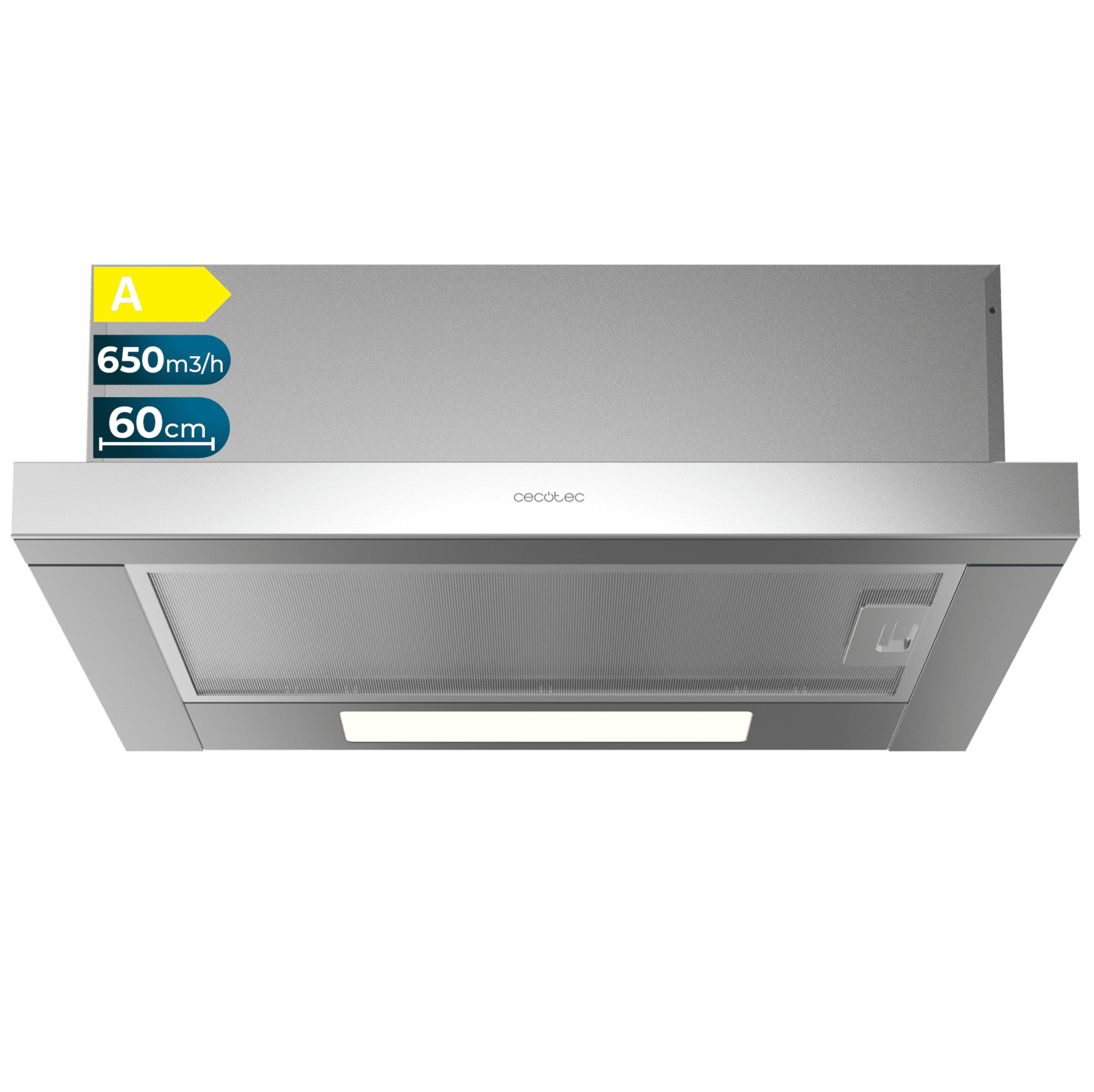 Bolero Flux TLM 606500 Inox A Campana extratora telescópica de 60cm de ancho, acabado inox, potencia succión 650m3/h, Motor 165W, Clase A, control mecánico, 2 niveles de potencia y filtro de carbono.