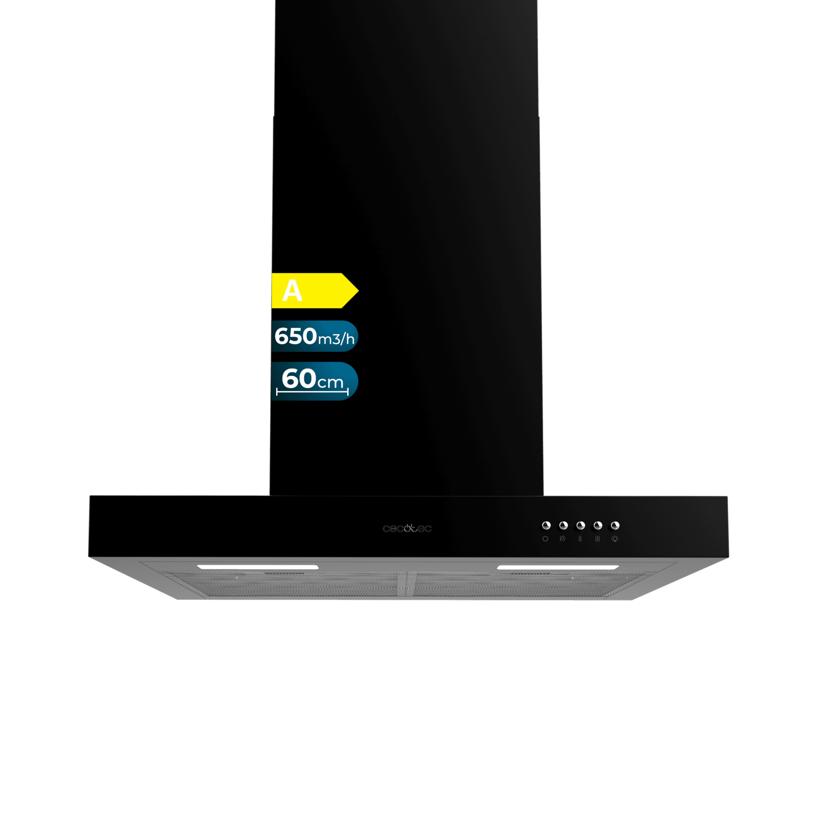 Bolero Flux TM 606500 Black A Campana T de 60cm de ancho, acabado negro, succión 650m3/h, Motor 165W, Clase A, control mecánico, 3 niveles de potencia, luz y filtro de carbono.