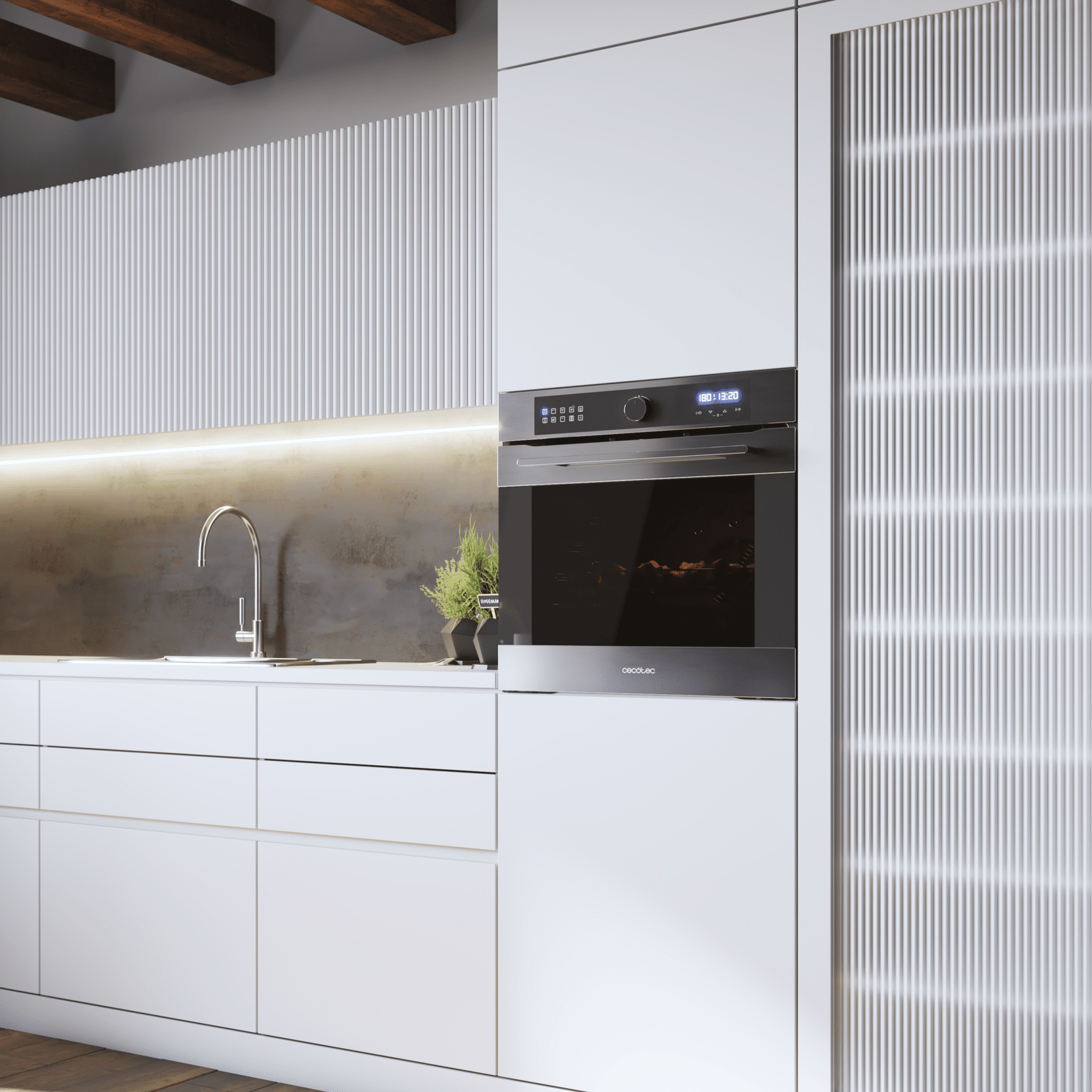 - Cocina varias recetas a la vez: el horno cuenta con una capacidad de 72 L con guías telescópicas y 5 posiciones para que puedas cocinar diferentes recetas a la vez o una sola con la precisión de la alta cocina.