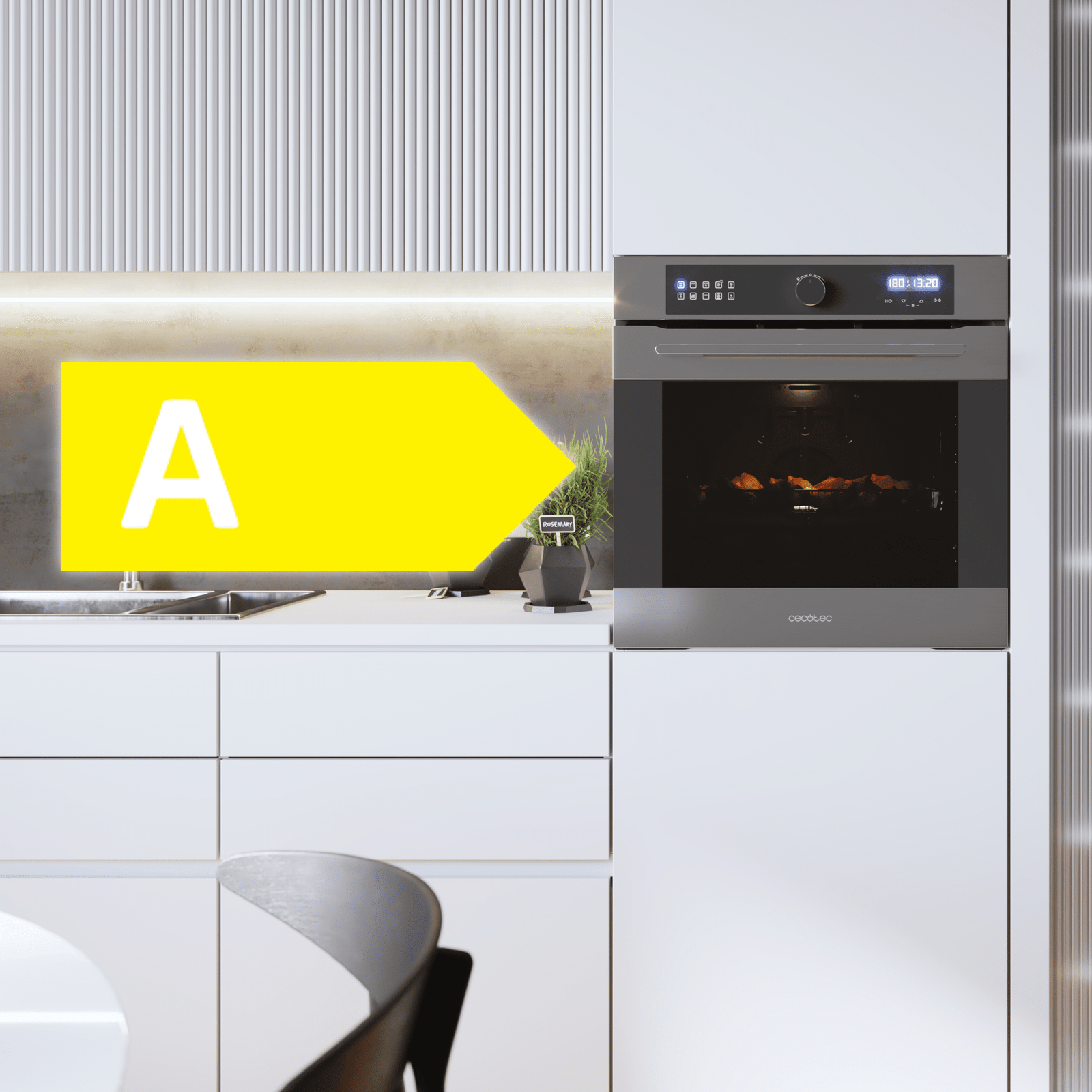 Ahorra¹ en cada uso y reduce el consumo energético sin restar eficacia durante la cocción de tus recetas gracias a su etiqueta energética Clase A. Súmate a la cocina saludable y eficiente.¹De acuerdo con la clase de eficiencia energética A obtenida según la normativa de etiquetado energético.