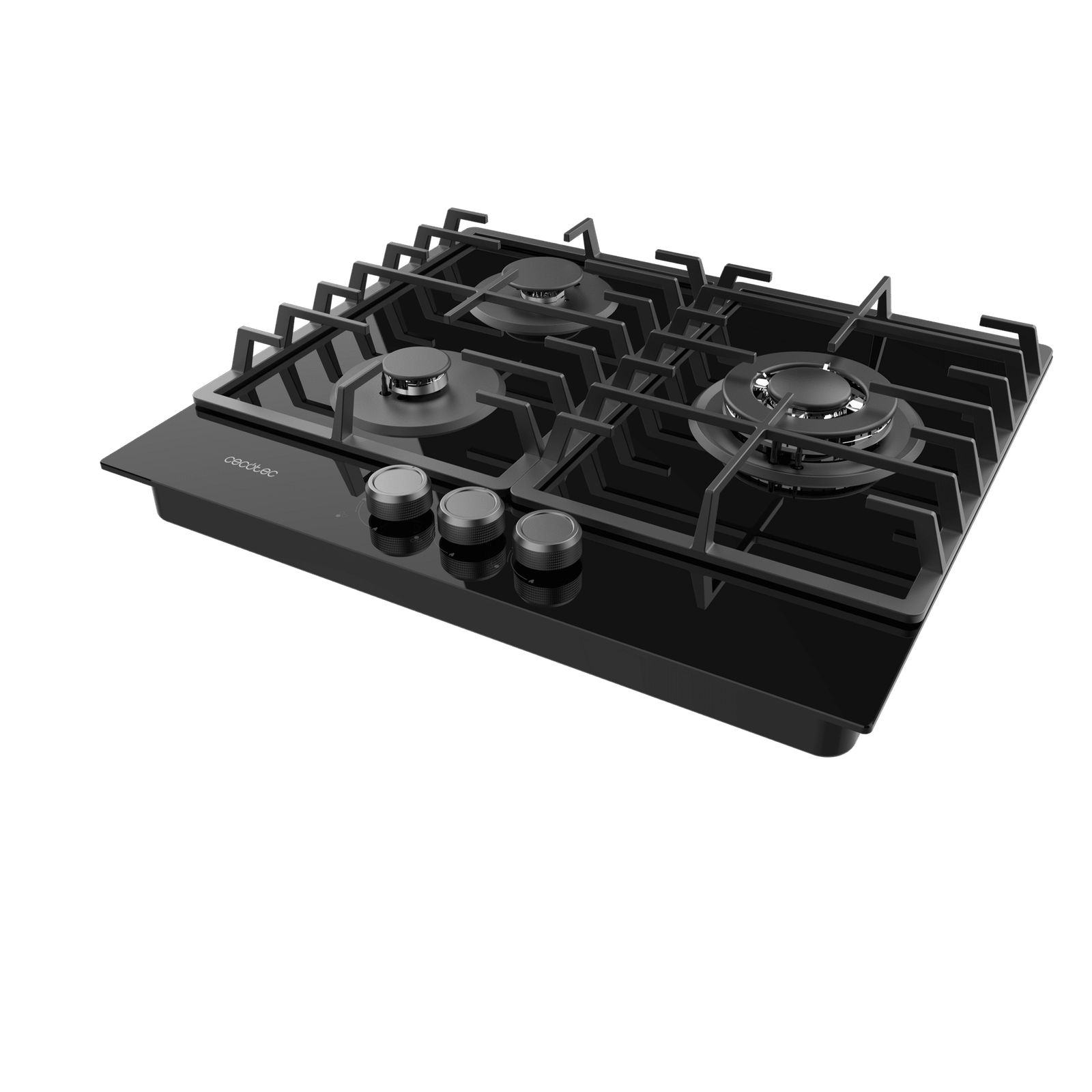 Bolero Squad G 3200F Glass Black Placa de gas preparada para instalación a GAS NATURAL DE 3 FUEGOS, acabado en cristal negro, parrillas completas de hierro fundido, potencia de 6,25kW, quemador WOK triple corona, encendido eléctrico, sistema de seguridad de las válvulas, para gas natural y accesorio para la conversión de gas incluído.
