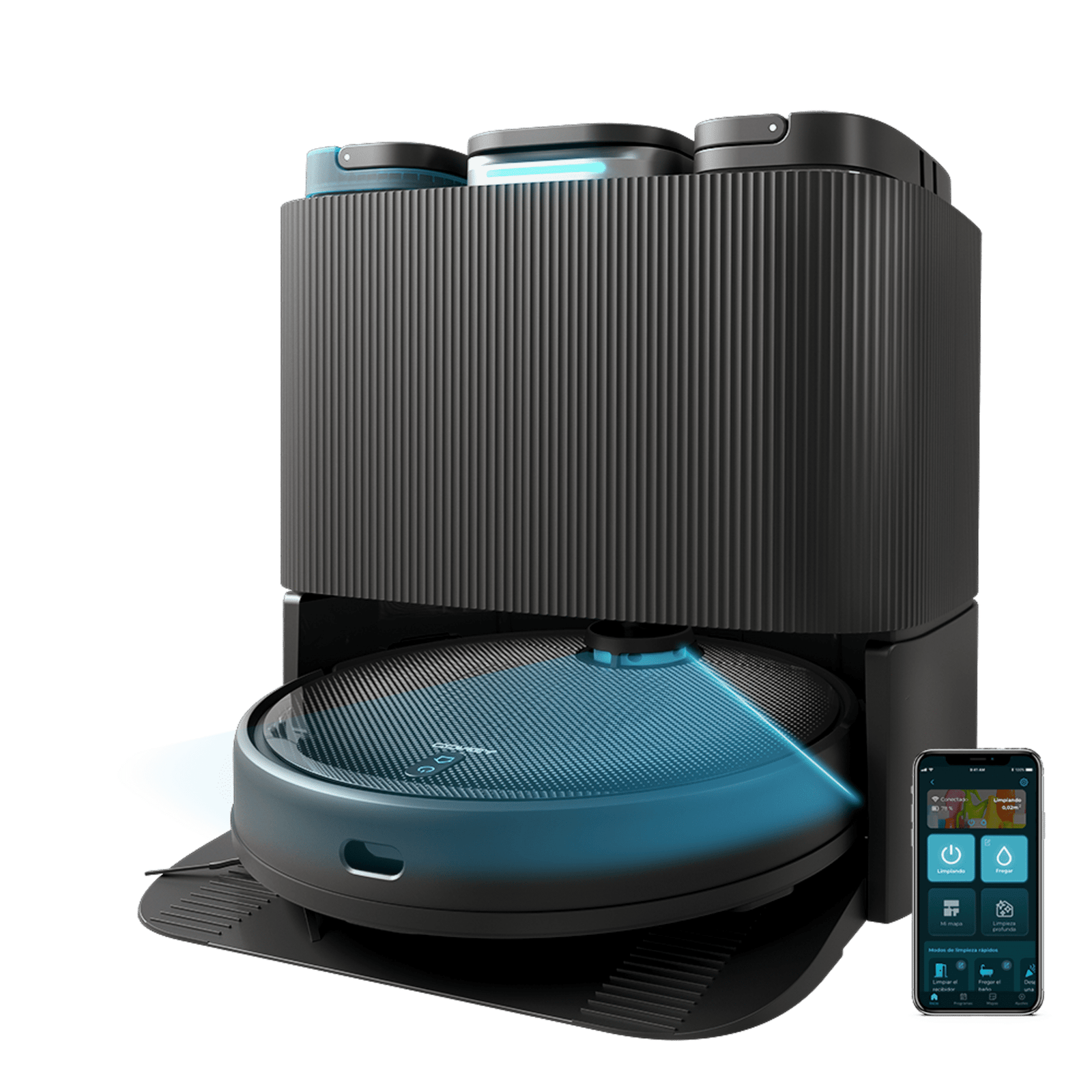 • La base es totalmente autónoma: se autovacía de polvo, limpia y seca las mopas, las hidrata para continuar limpiando y recoge el agua sucia tras limpiarlas.