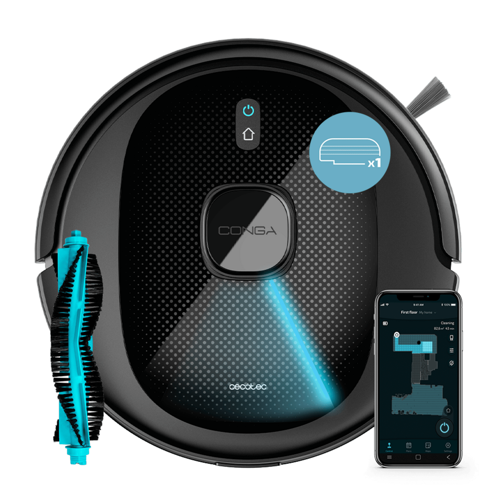 Conga 7490 Immortal Genesis. Robot aspirador con tecnología de navegación láser. Limpieza 4 en 1: barre, aspira, friega y pasa la mopa. Potencia de succión de 2600 Pa. 120 minutos de autonomía. Cepillo central multifunción, mopa de fregado y 1 cepillo lateral. 4 niveles seleccionables de potencia de aspiración y de agua de fregado. Programación. Control APP y asistentes virtuales.