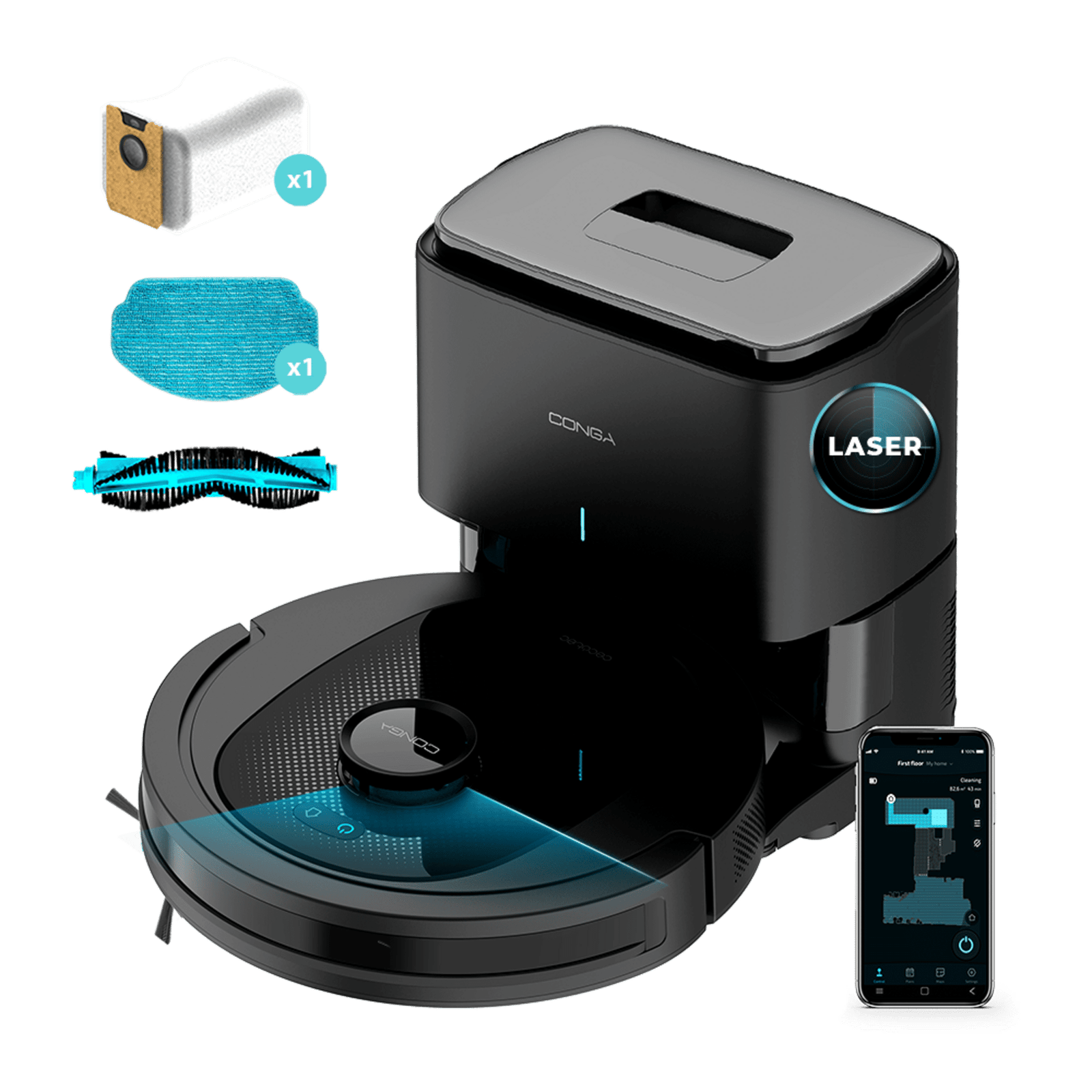 Conga 7490 Ultimate Home Genesis Robot aspirador con navegación láser y base de autovaciado. Limpieza 4 en 1: barre, aspira, friega y pasa la mopa. Potencia de succión de 4000 Pa. 120 minutos de autonomía. Cepillo central multifunción, mopa de fregado y 1 cepillo lateral. 3 niveles de potencia de aspiración y de fregado. Control APP y asistentes virtuales. Detección de bolsa automática. 2 litros de capacidad.