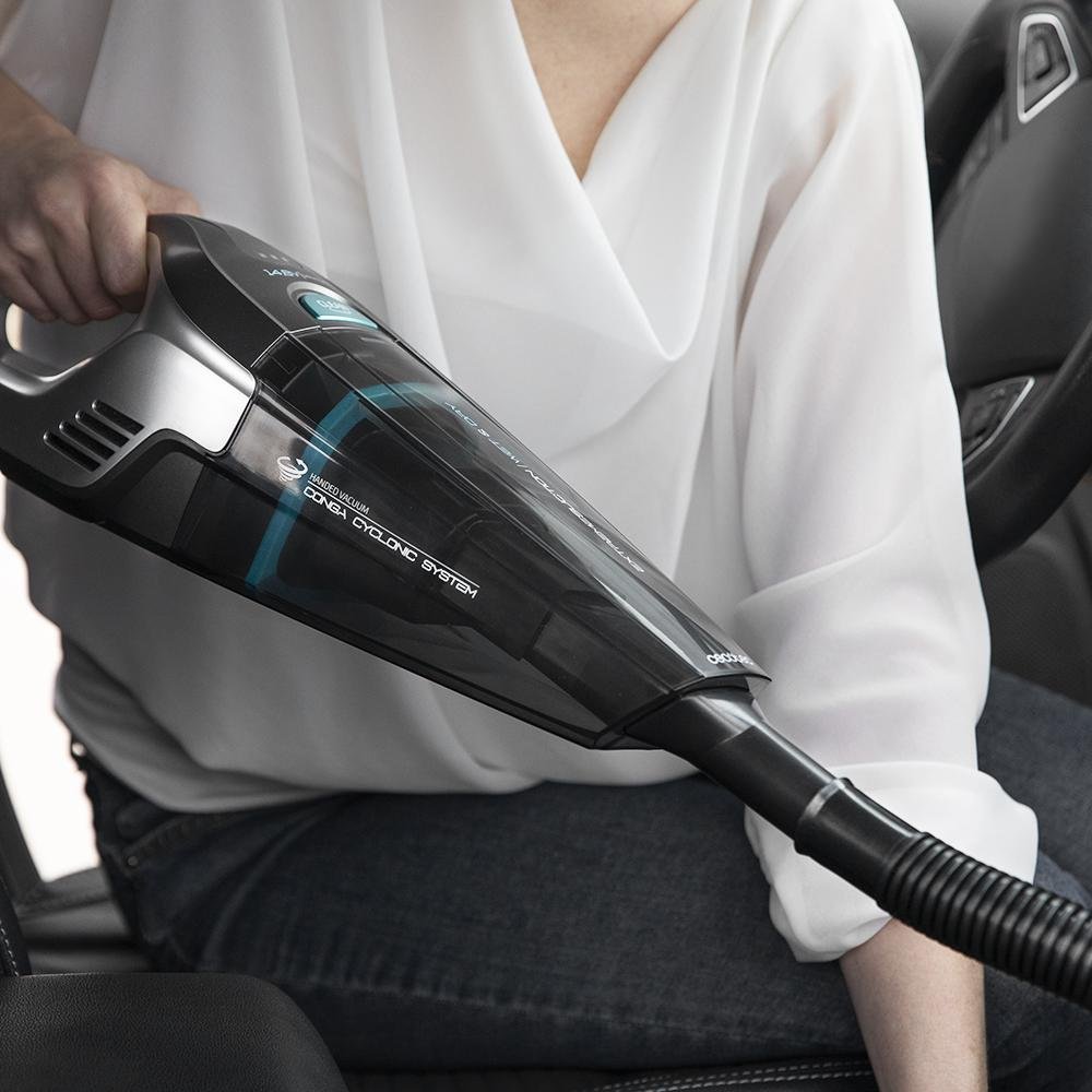 - Aspirador de mano de 14,8 V. Aspira todo tipo de sólidos y líquidos. Tecnología ciclónica y gran autonomía de hasta 20 minutos.