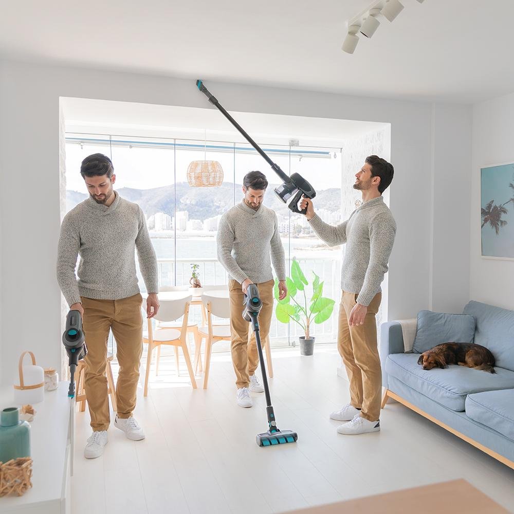 Aspirador sin cables 3 en 1: vertical, escoba y de mano, con motor digital brushless, máxima potencia de succión y diseño 360 para eliminar el polvo de cualquier lugar con total comodidad.