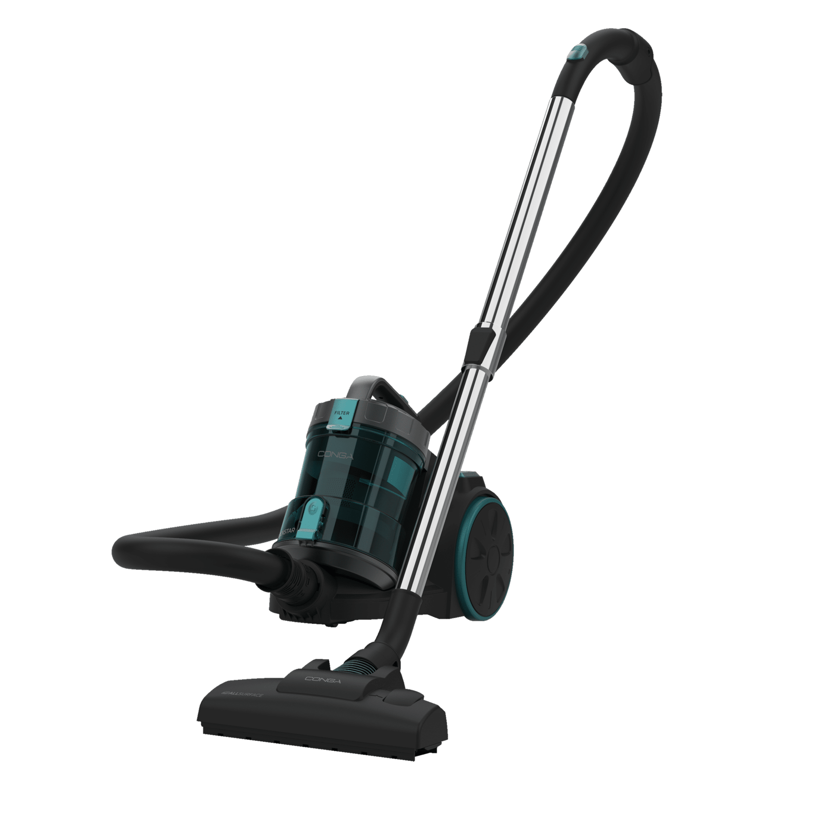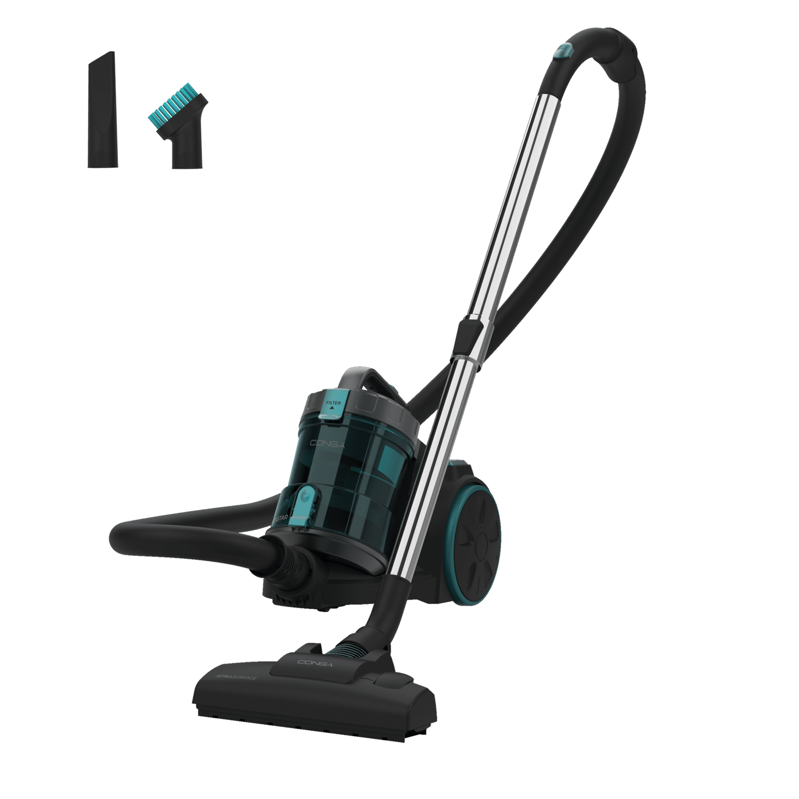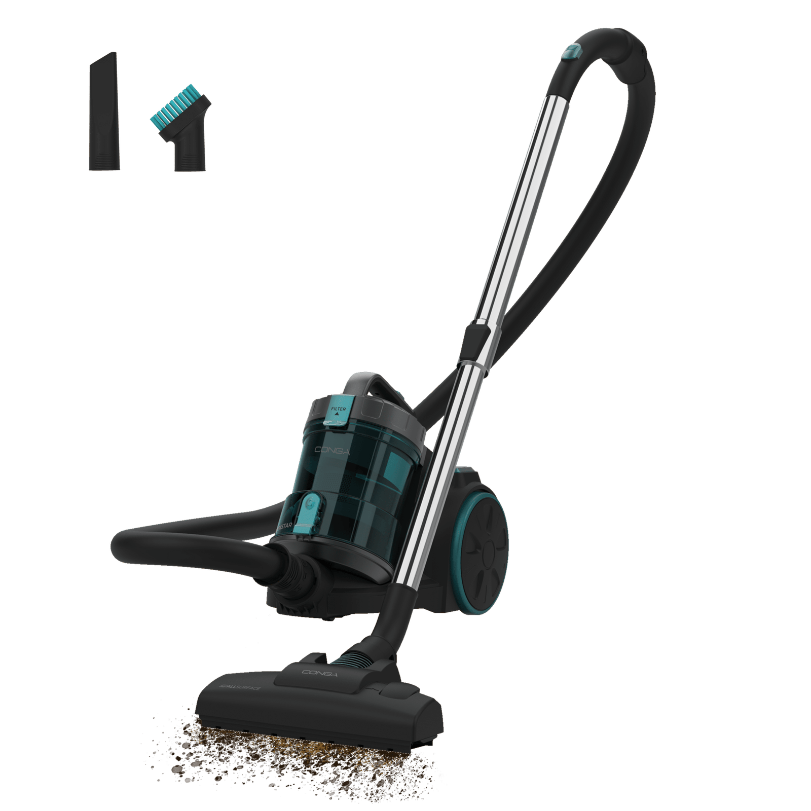 Conga Rockstar Cyclonic XL Aspirador de trineo sin bolsa de 890 W, con depósito de 2,5 litros y filtro de alta eficiencia para un aire más limpio. Cuenta con tubo telescópico metálico ajustable y accesorios especiales para muebles y esquinas, facilitando la limpieza en las zonas difíciles.