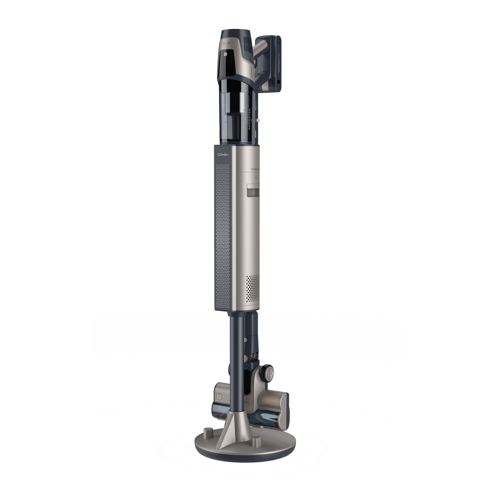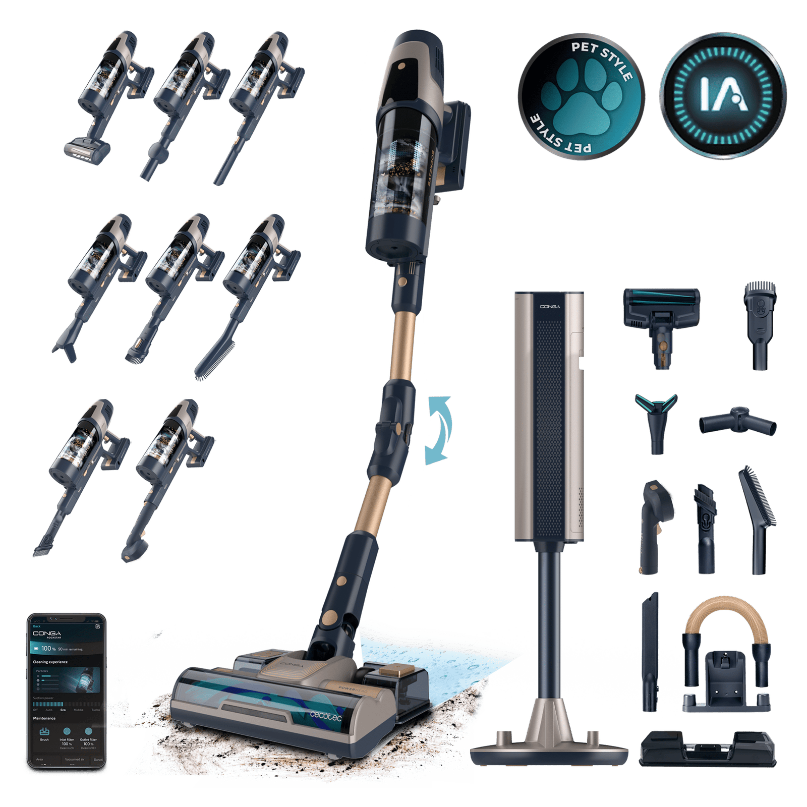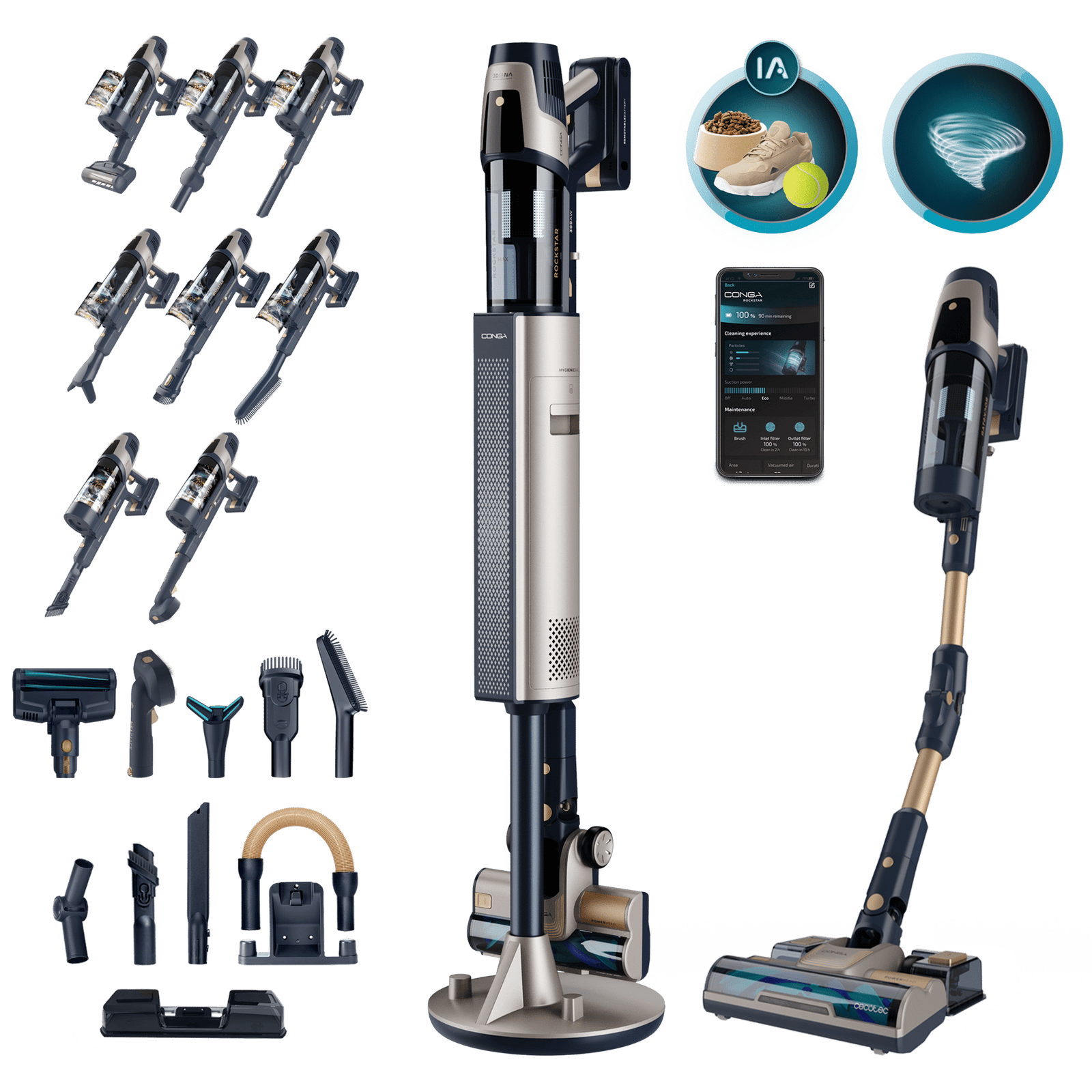 Conga Rockstar RZ90 AI AquaPet Flex Connected X-Treme Aspirador vertical con base de autovaciado. 310 AW y 850 W. Tubo flexible. Inteligencia Artificial y contador de partículas. APP. Cepillo de animales y accesorio WaterTank de fregado.