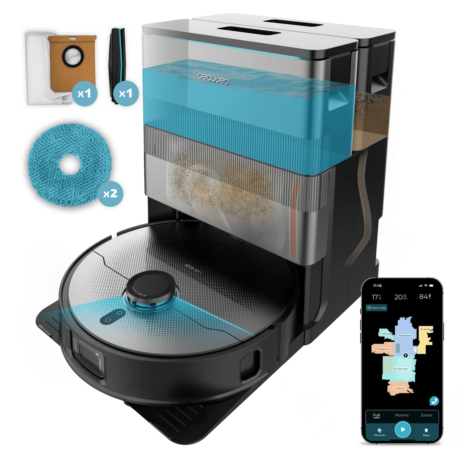 Conga X100 X-Treme Robot aspirador con sistema de limpieza adaptativa. 20000 Pa de poder de succión, base 4 en 1 con desinfección. Inteligencia Artificial con cámara. Mopas giratorias elevables. Cepillo lateral y mopa extensible. App con video manager.