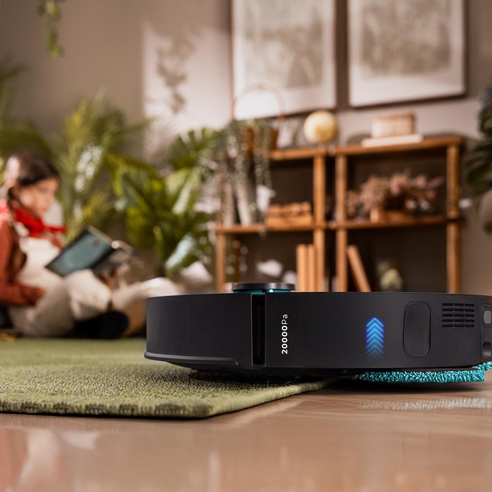Su fregado inteligente eleva las mopas cuando detecta alfombras para protegerlas de la humedad, potenciando la aspiración para aspirar hasta la microsuciedad.