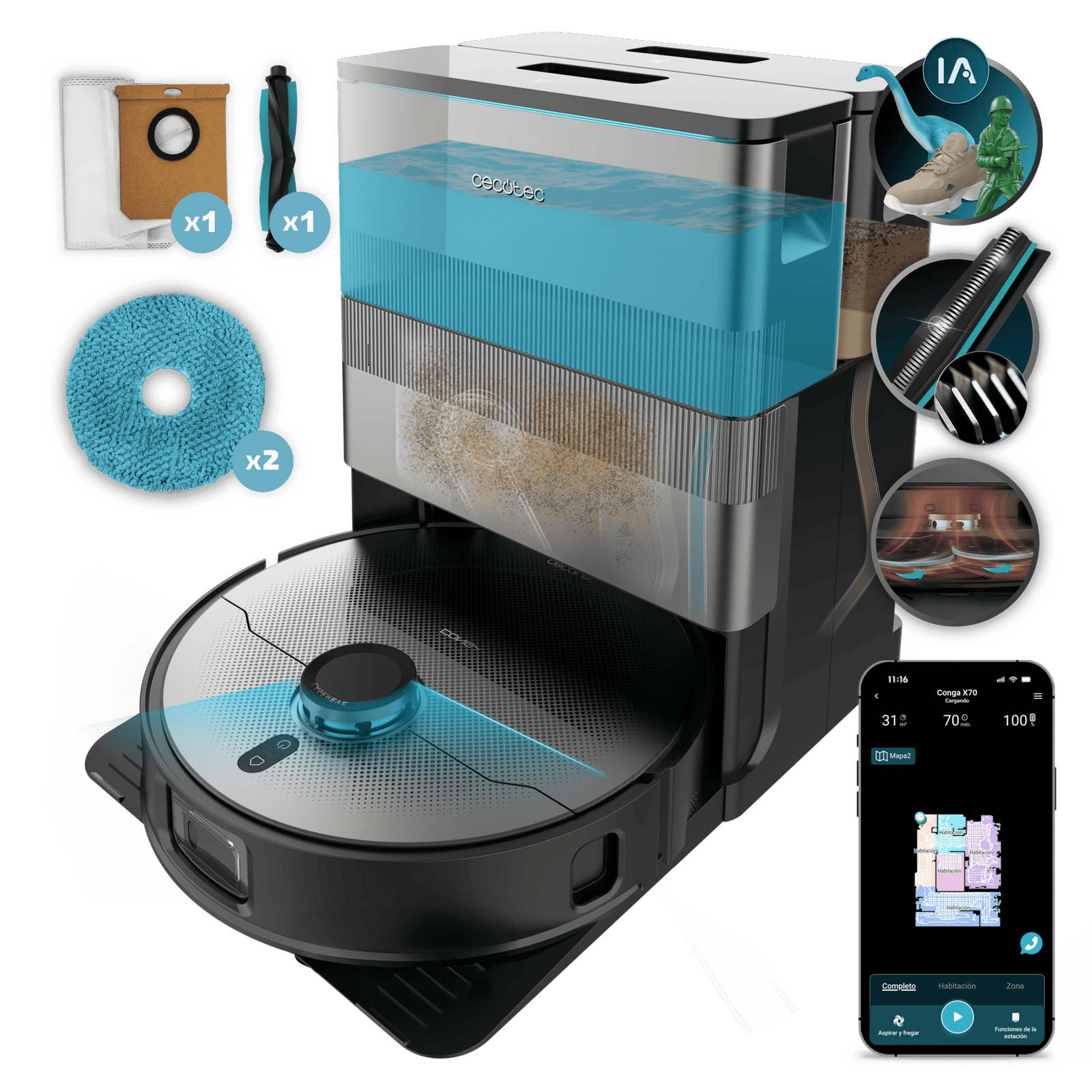 - Estación All-in Home con desinfección. Mantenimiento completo para un aspirado y fregado perfectos. Su tecnología SpinCare: escurre el agua sucia, desinfecta las mopas con agua caliente (70ºC), las seca con aire caliente y autorellena el depósito de agua del robot. Y olvídate del polvo y las alergias con su autovaciado su bolsa hasta en 12 semanas* *El tiempo puede variar según las condiciones ambientales y hábitos de uso.