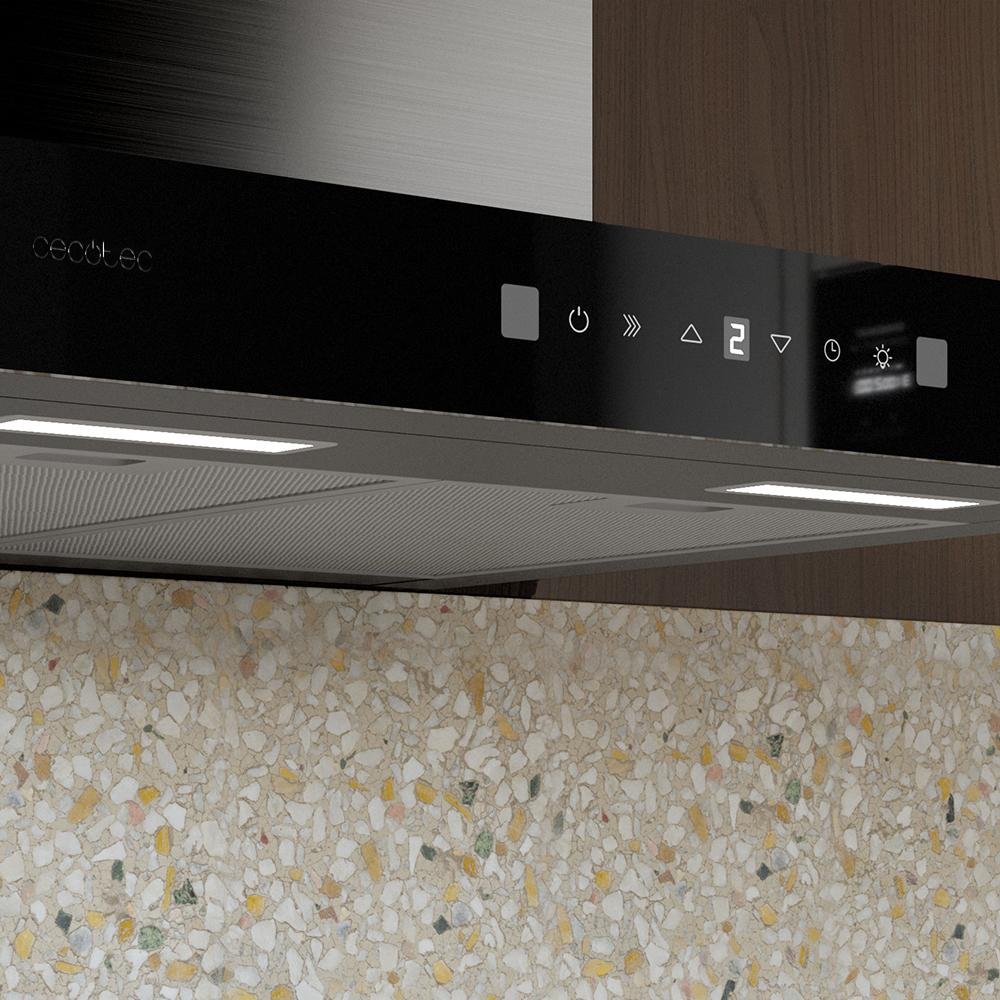 - Acabado frontal de cristal negro: campana extractora con acabados frontales de cristal negro, para un diseño estilizado y elegante.