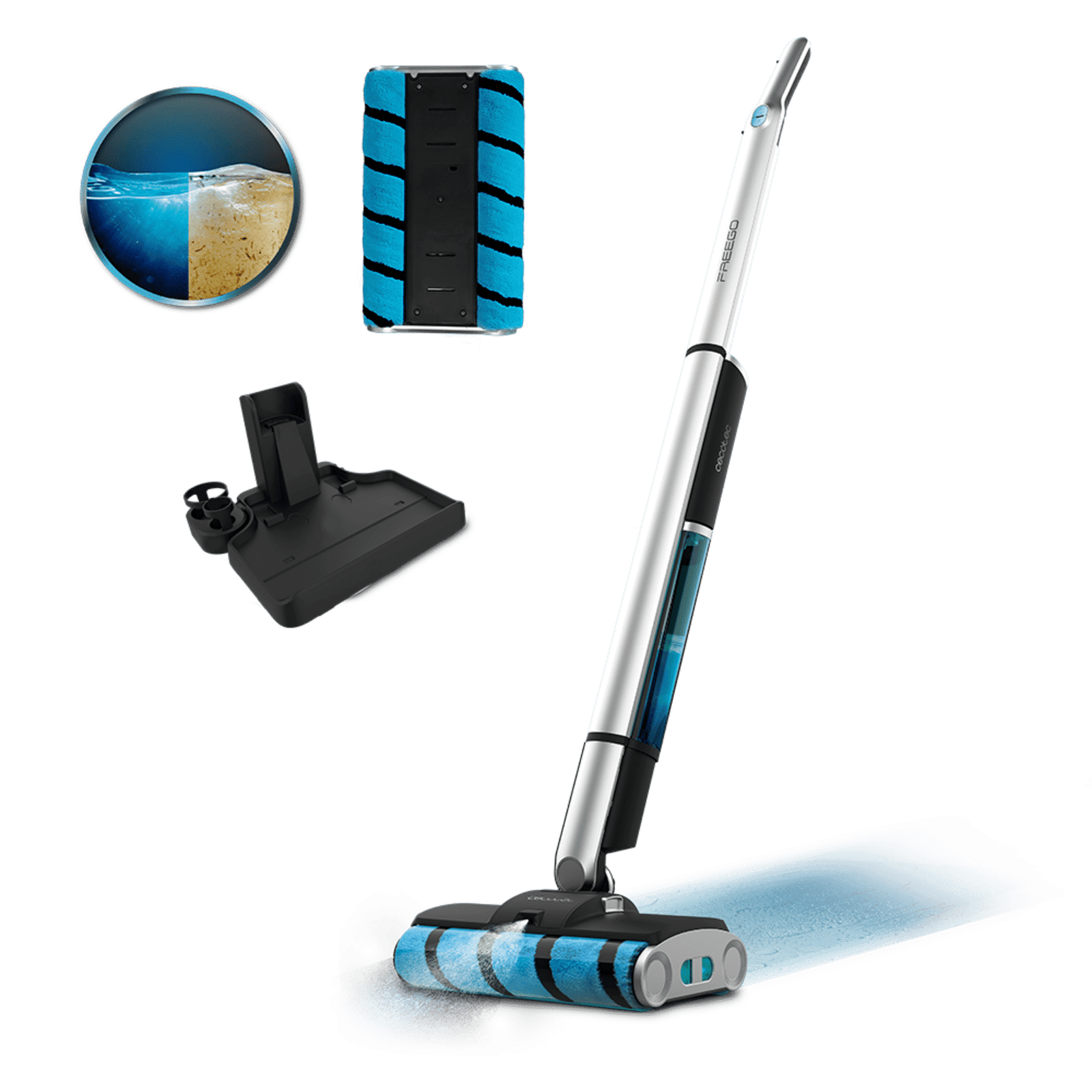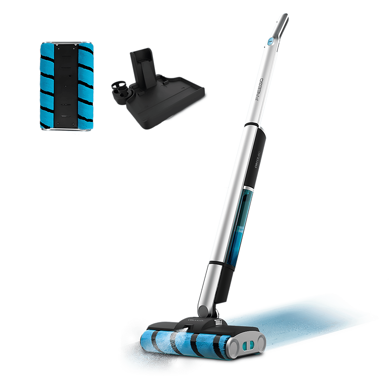 FreeGo Wash Twice Spray X-Treme Fregona eléctrica FreeGo Wash Twice Spray. 40 minutos de autonomía. Doble rodillo. Depósito de agua limpia de 450 ml y agua sucia de 350 ml. Pulverizador de agua y base de autolimpieza. Con spray pulverizador sobre la superficie.