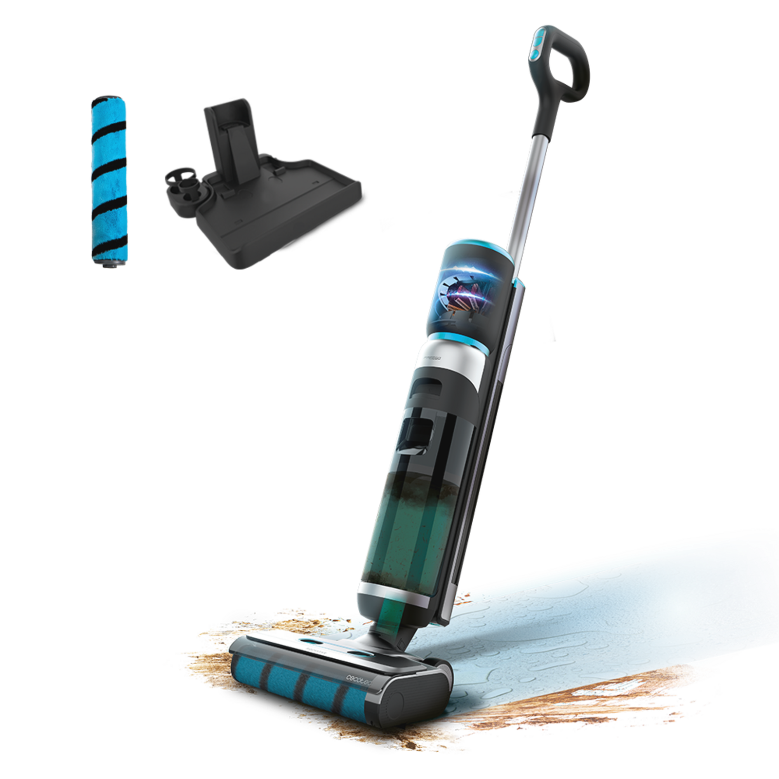 - Friega y aspira: friega y aspira de forma simultánea para una limpieza profunda en menos tiempo tanto de sólidos como de líquidos.